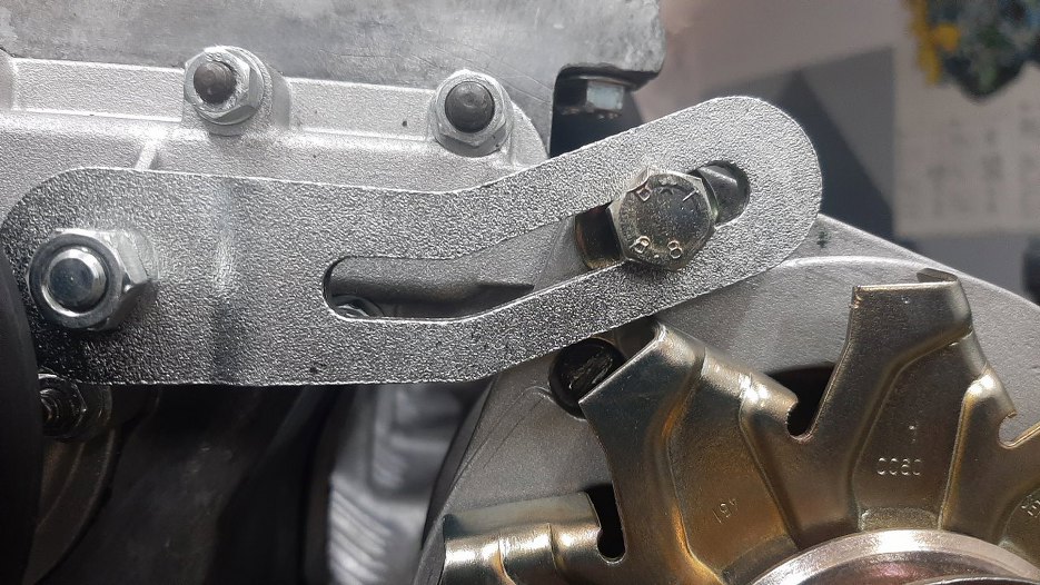 Założyłem też płaskownik regulacyjny z tego starego alternatora. Pasuje, ale nie da się obrócić wiatrakiem, bo zawadza. Ogarnie się.