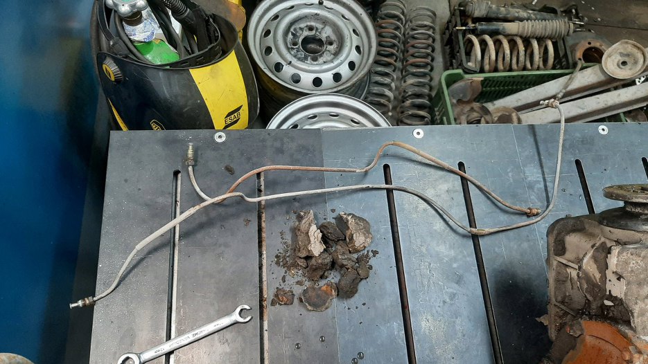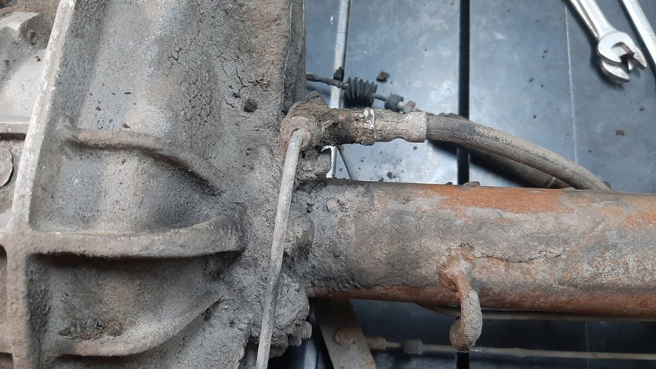 Gdzieś tu, pod tym zaschniętym błotem, jest trójnik rozdzielający rurkę hamulcową na oba zaciski.
