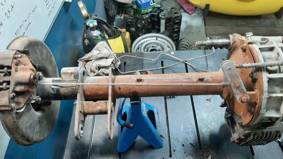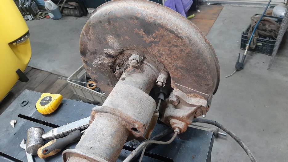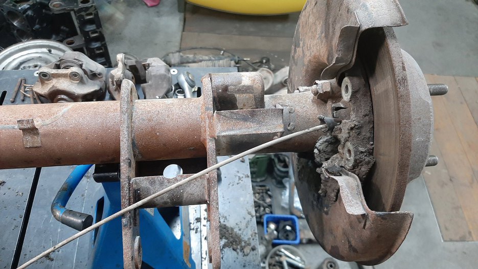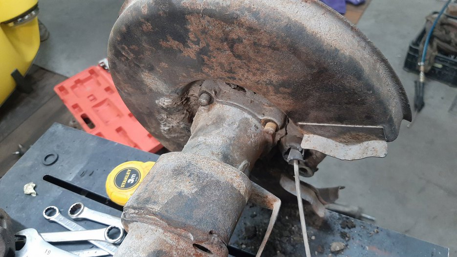 Odkręciłem tarcze kotwiczne od obudowy półosi. Myślałem, że dam radę teraz wyjąć półoś, ale nie chciała wyjść. Nie chciałem wyciągać jej na siłę w obawie przed uszkodzeniem czegoś, więc na razie ją zostawiam.