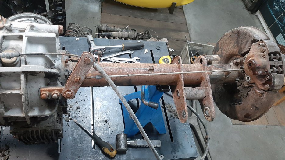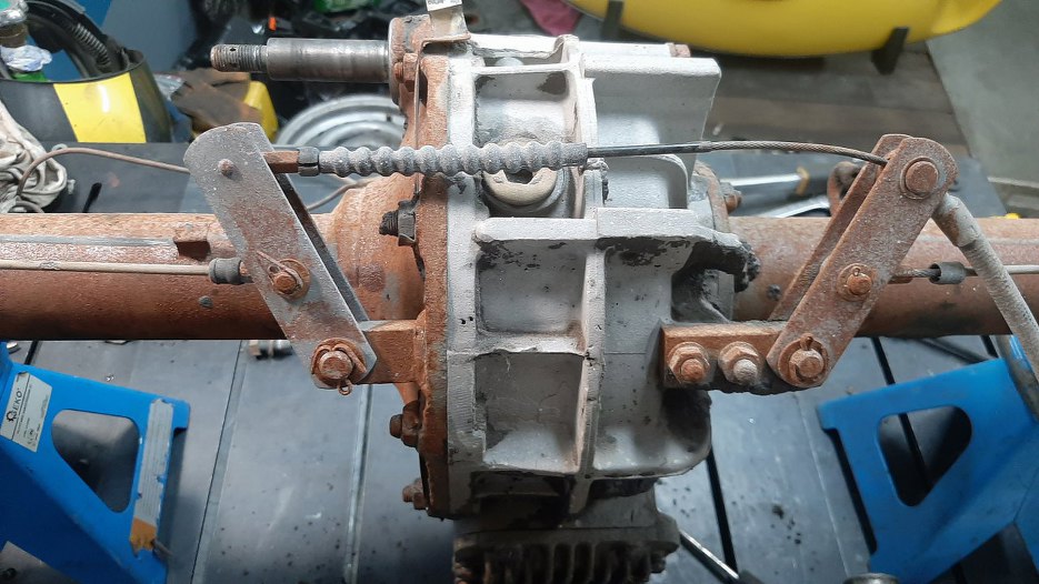 ... potem pośrodku mostu jest linka hamulcowa idąca od dźwigni w kabinie i rozdzielająca siłę hamowania na dwie linki boczne...