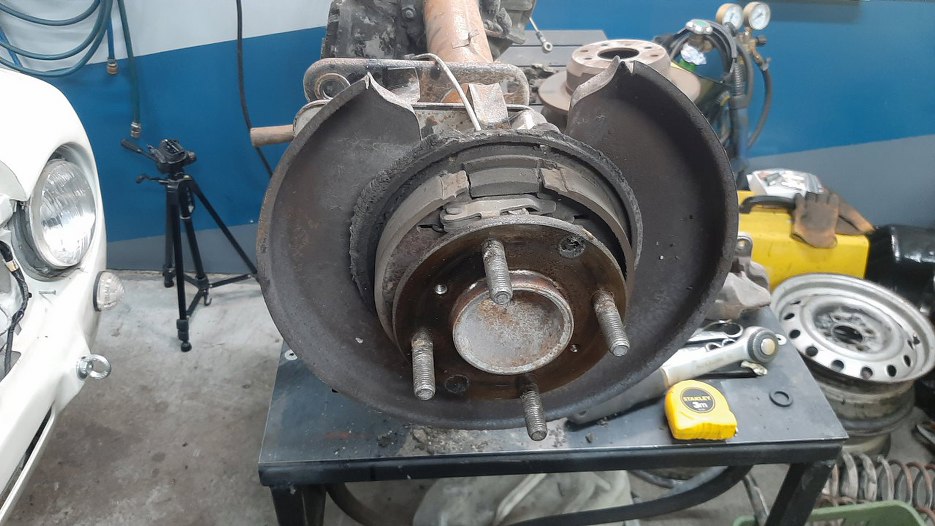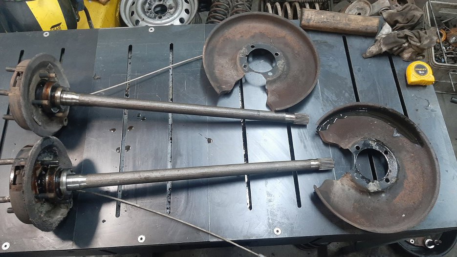Z półosi zdjąłem też osłony tarcz hamulcowych. Tarcze kotwiczne nie chcą zejść, wydaje mi się, że żeby je zdjąć, trzeba zdemontować też łożyska półosi.
