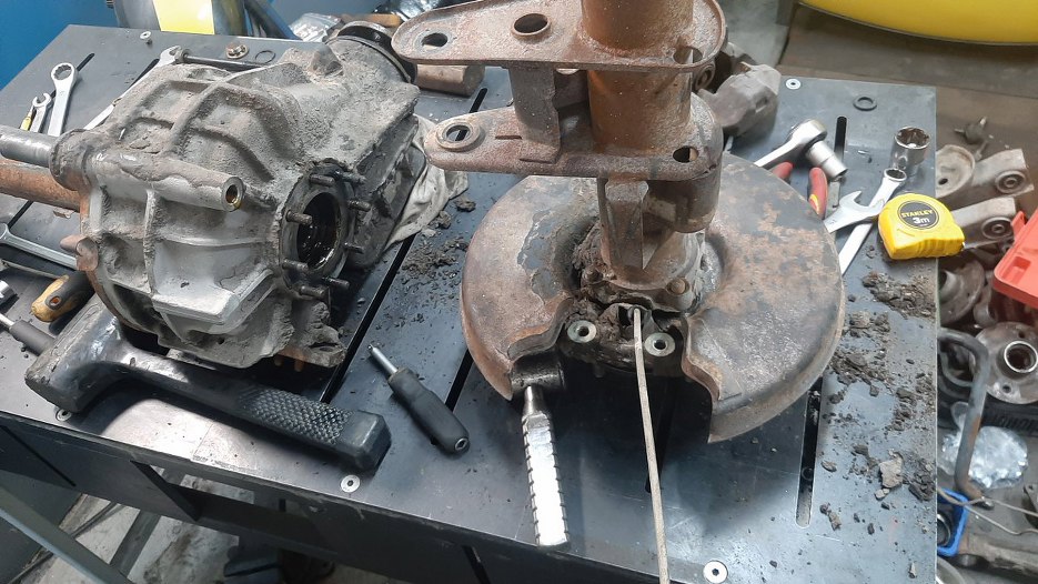 Zacząłem od odkręcenia jednak prawej strony. Zdjąłem obudowę półosi razem z półosią.