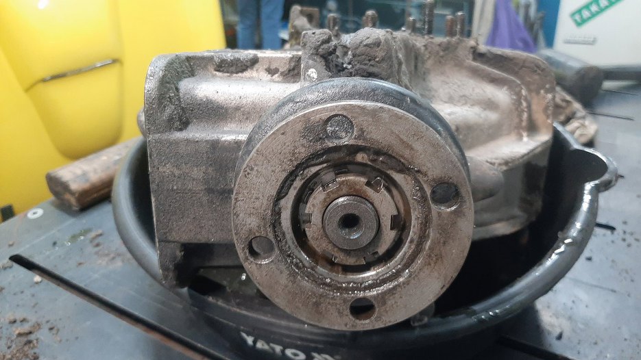 Potem odkręciłem obudowę lewej półosi, która jednocześnie stanowi całą lewą stronę obudowy mechanizmu różnicowego i trzyma jego łożysko.