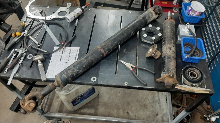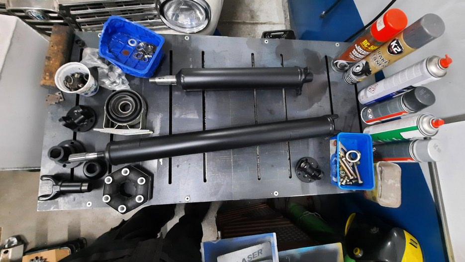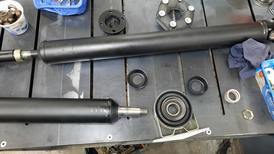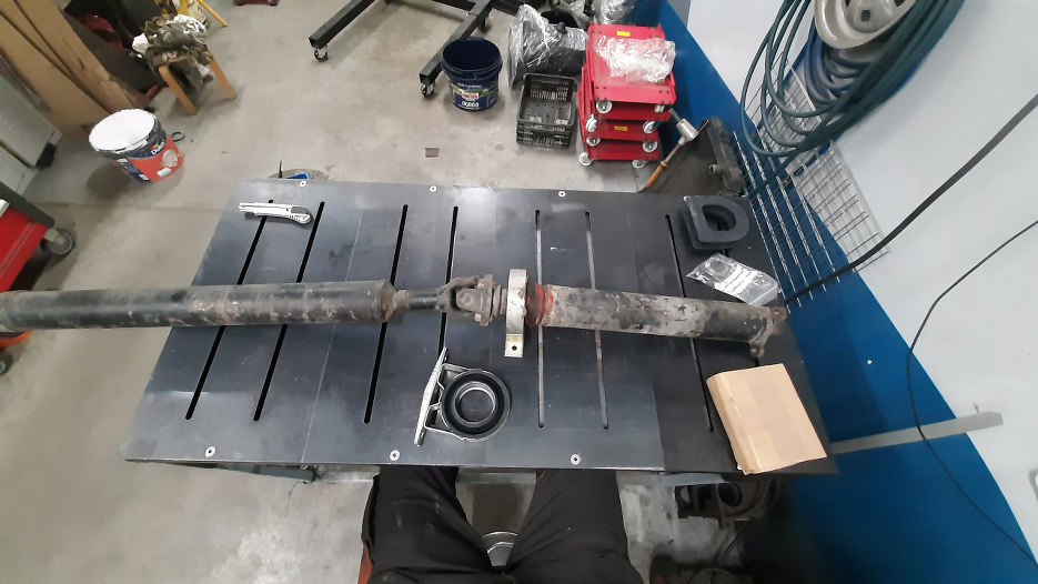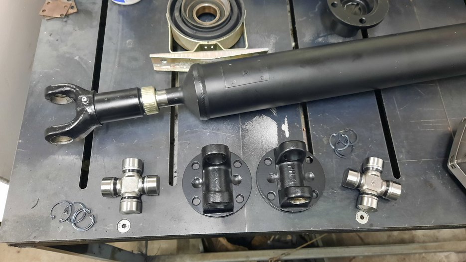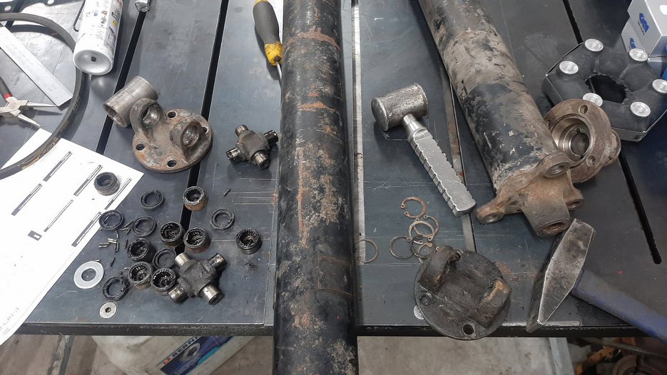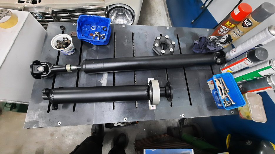 Założone. Przykręciłem też flanszę. Tych dwóch połówek wału nie skręcam, bo będzie mi je łatwiej zamontować w samochodzie oddzielnie.