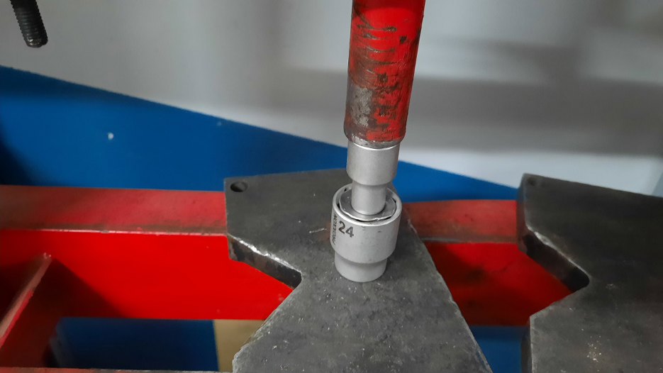 Wystarczy ją trochę ścisnąć prasą znowu i już jest trwale wciśnięta w rant stali. Teraz już nie wypadnie.