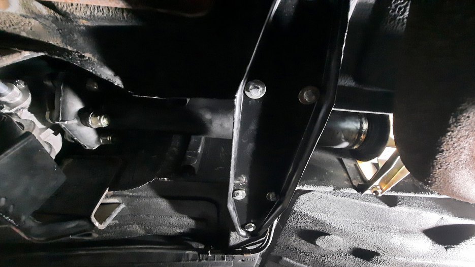 Ciemno tu mniej więcej tak, jak to okrećlił Balcerek w serialu "Alternatywy 4", ale założyłem na wyjściu skrzyni ten gumowy precel, a na niego pierwszą część wału. To jest po lewej stronie. Na końcu tej części, po prawej, jest podpora wału - ją przykręciłem do nadwozia. Czarny element pośrodku to wzmocnienie nadwozia. Drugą część wału przykręcę jak już most będzie na miejscu.