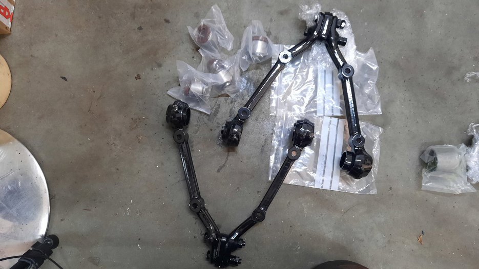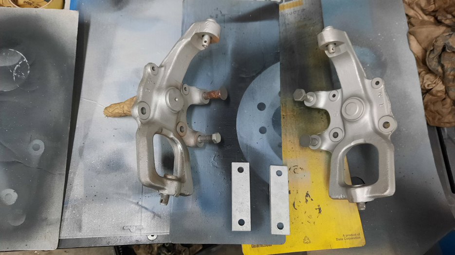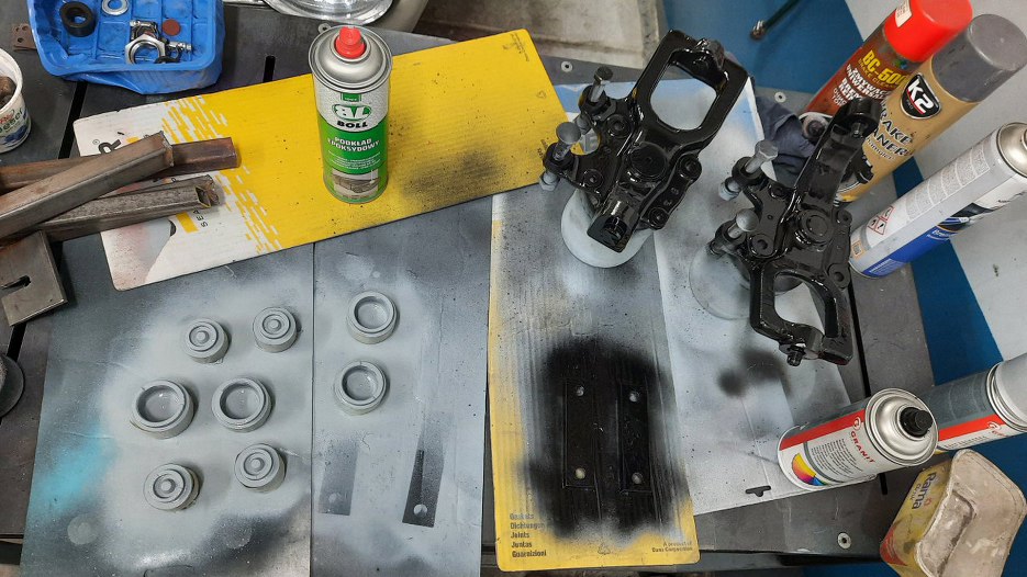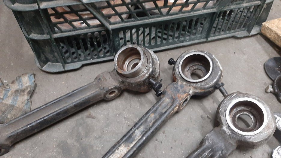 A połówki wahacza dolnego skręciłem razem. Pomiędzy połówkami jest sworzeń. Sworznia nie mogłem przykręcić, bo też ma smar w środku, więc obciąłem z niego przegub, a przykręciłem w wahacze tylko jego część mocującą. Takie kombinacje są potrzebne, żeby dobrze zabezpieczyć części do piaskowania. A to tylko dolne wahacze :). W każdym razie tu już widać wahacze po malowaniu proszkowym, ale jeszcze nie odbezpieczone z tych zaślepek.