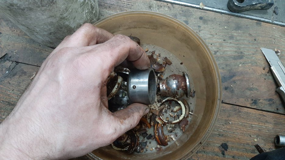 Resztę części zawieszenia przygotowałem do piaskowania i malowania proszkowego. Wszystkie ważne płaszczyzny trzeba jakoś zabezpieczyć przed piaskiem i farbą. Otwory na sworznie na przykład zatkałem obciętymi końcówkami sworzni. Miałem też do zaślepienia otwory na tuleje w dolnych wahaczach i nie miałem żadnych części do tego się nadających. Wziąłem więc stare tuleje, wyjęte z wahaczy i odciąłem ich końcówki na tokarce. Mogłem wtedy wyjąć z nich wszystko ze środka. Widać w jakim stanie były plastiki wewnętrzne tych tulei.