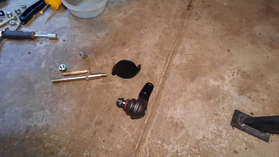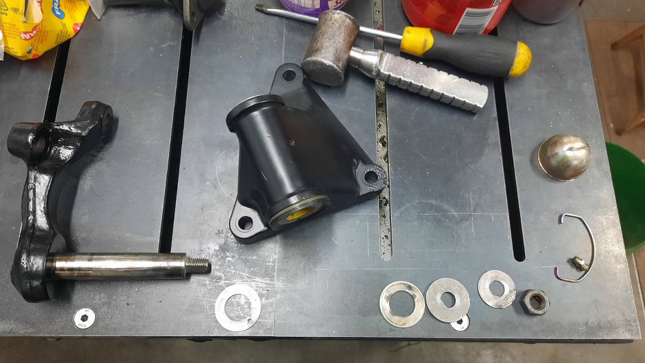 Przygotowałem dolny sworzeń zwrotnicy. Jego śruby mocujące trzymają też talerzyk-odbój wahacza.