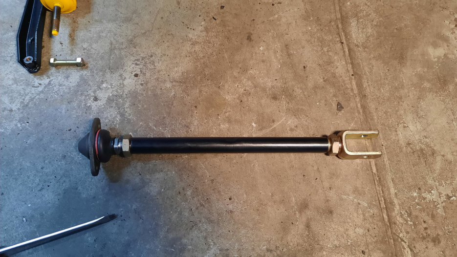 Włożyłem na miejsce wahacz górny i drążek reakcyjny i skręciłem to razem. Drążek reakcyjny jest fabrycznie z regulacją, wahacz jest na sztywno. Ale tu został zastosowany regulowany wahacz górny, żeby można było regulować kąt pochylenia koła.