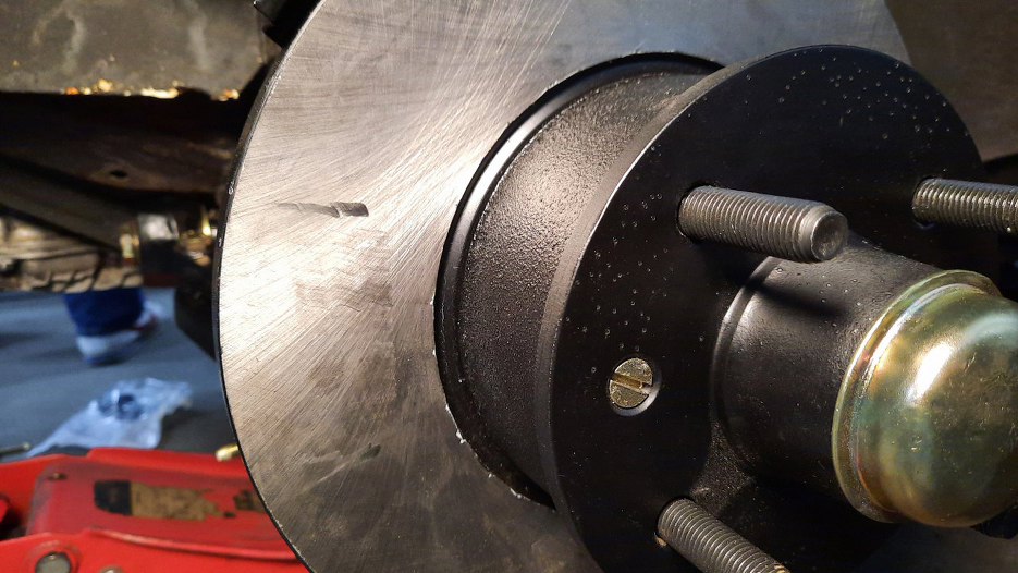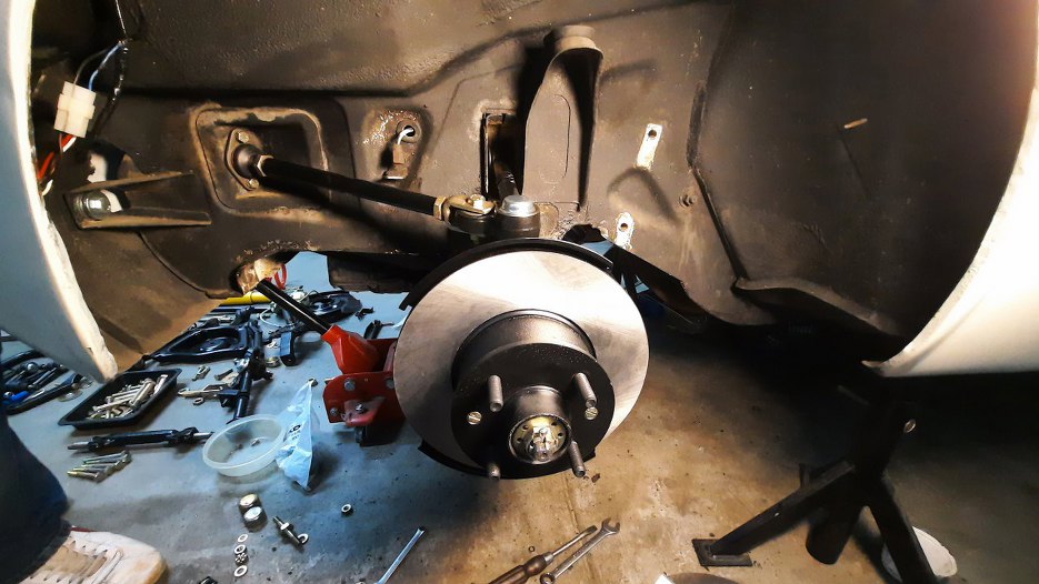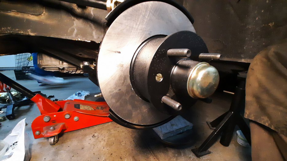 Założyłem piastę z tarczą hamulcową. I tu pojawił się pierwszy problem - tarcza lekko skrobie w zwrotnicę... Po kilku kombinacjach co może być nie tak stwierdziłem, że założę jeszcze zacisk, żeby zobaczyć jakto wszystko do siebie pasuje, bo coś mi nie gra.