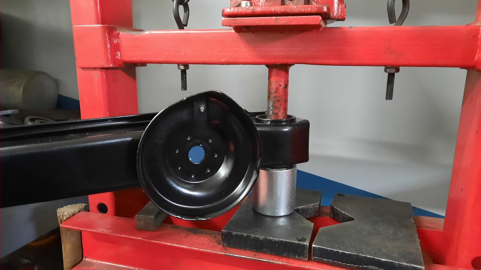 Po wciśnięciu gum wbiłem całość na wahacz na prasie. O tyle fajnie, że i na wahaczu i na obudowie gumy są znaczniki w jakiej pozycji to złożyć.