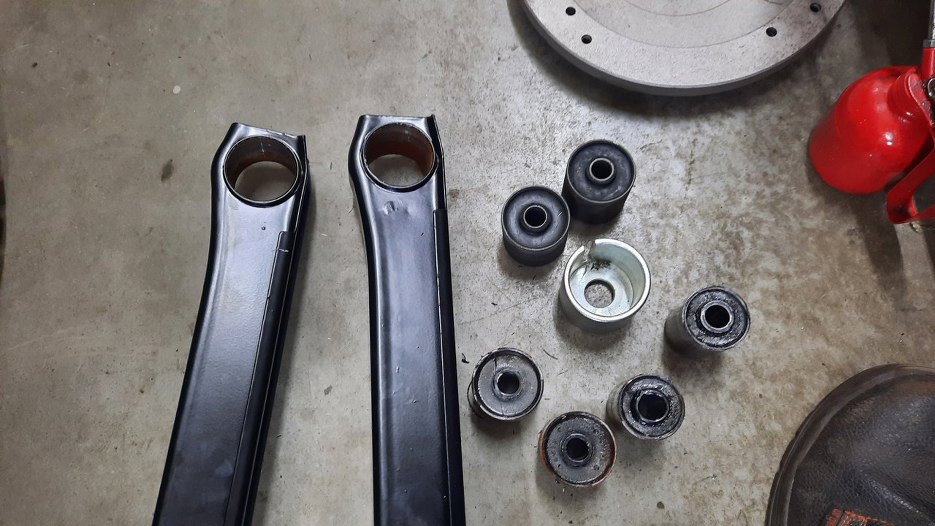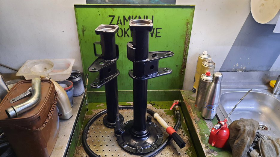 Inne części oddałem do malowania proszkowego. W wahaczach zostawiłem stare tuleje jako zabezpieczenie otworów. Teraz trzeba je wymienić.