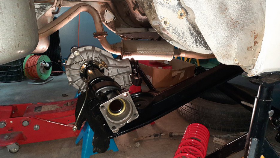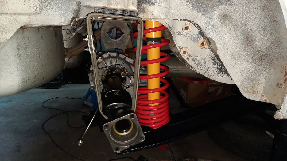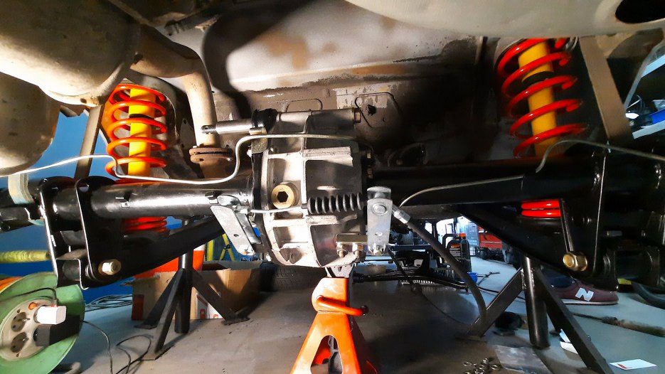 Potem przykręciłem to do nadwozia, ale jakoś zapomniałem o zrobieniu zdjęcia. O tyle trudno to było zrobić, że zawieszenie jest teraz w pozycji opuszczonej, więc dałem radę złapać tylko po jednej śrubie w każdym z bocznych mocowań. Żeby złapać resztę, musiałem przestawić kobyłki spod karoserii pod most. I poprosić dwie osoby o zajęcie miejsc na tylnej kanapie. Dopiero wtedy obciążenie samochodu spowodowało przekręcenie górnego wahacza tak, że dałem radę wkręcić pozostałe śruby.