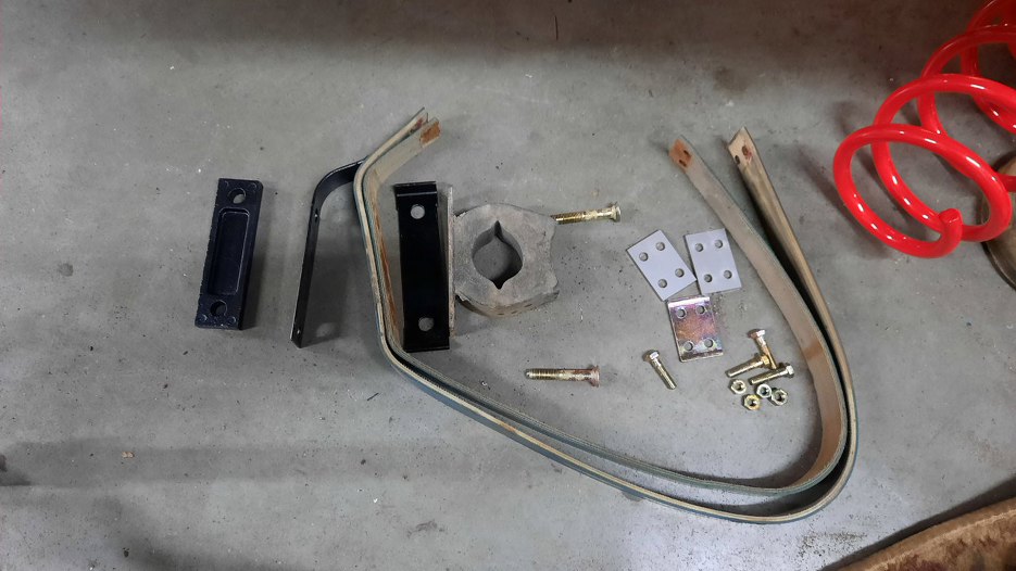 Zanim założę sprężyny i amortyzatory przygotowałem pasy parciane - ograniczniki skoku tylnego zawieszenia. Nie chcę, żeby po założeniu sprężyn cała ich siła działała tylko na amortyzator jako ogranicznik. Pasy są w dobrym stanie, wystarczyło je tylko umyć. Reszta części jest standardowo odnowiona.