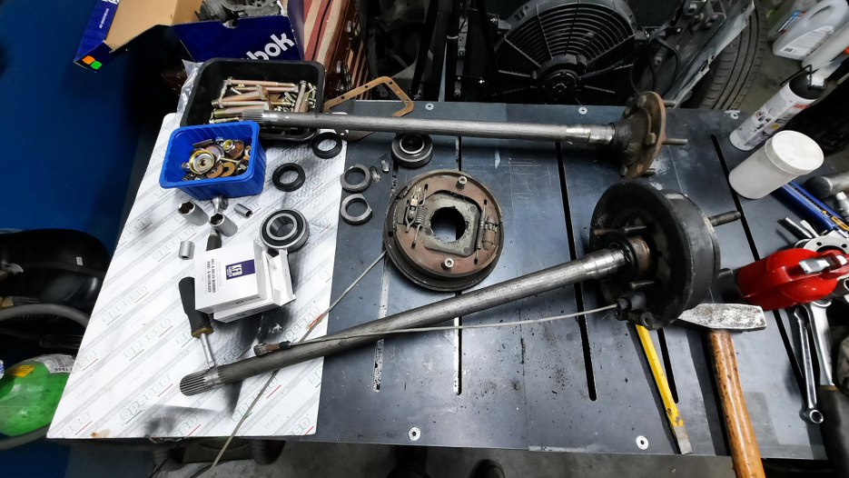 Zapomniałem zrobić zdjęcie, ale wcisnąłem na prasie łożyska i pierścienie je trzymające. Potem włożyłem półosie do mostu.