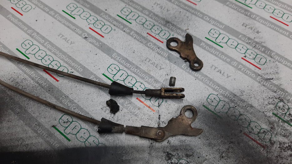 W międzyczasie zauważyłem też, że na nowej lince hamulca ręcznego nie ma końcówki. Odkręciłem ją ze starej linki. Wcześniej jej nie zauważyłem, bo była tak zapyziała, że wyglądała na integralną część linki.