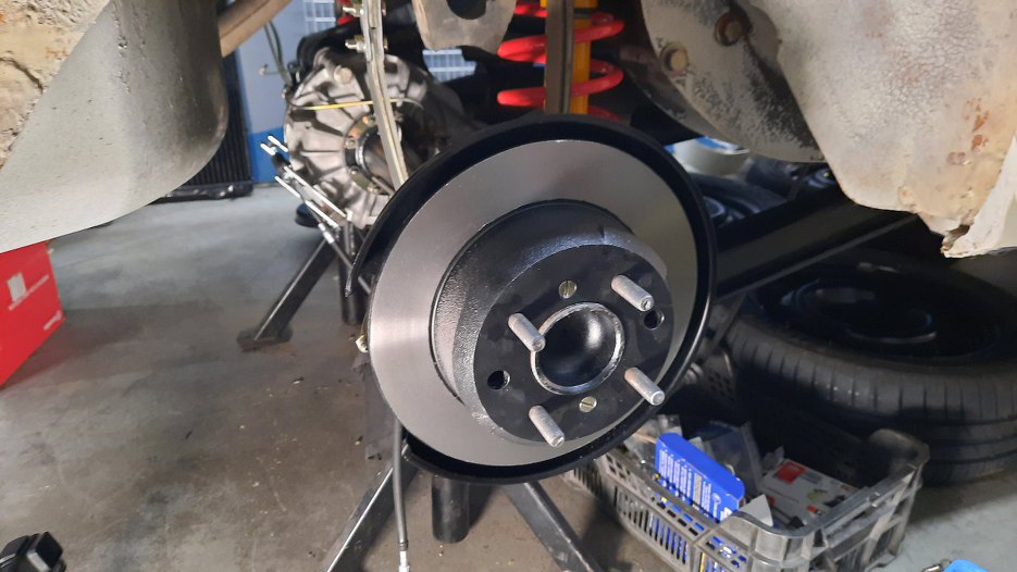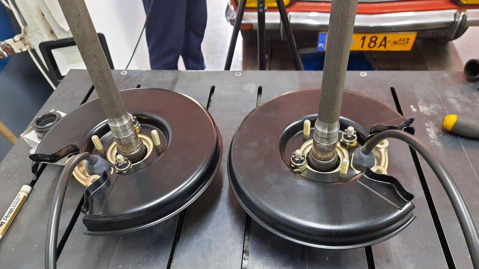 Potem założyłem tarcze kotwiczne i osłony na półosie. Próbowałem to przytrzymać nakrętkami, ale niestety nie mieszczą się wtedy łożyska i musiałem to potem zdjąć. Mogłem też zdjąć osłony, bo przechodzą swobodnie przez łożyska.