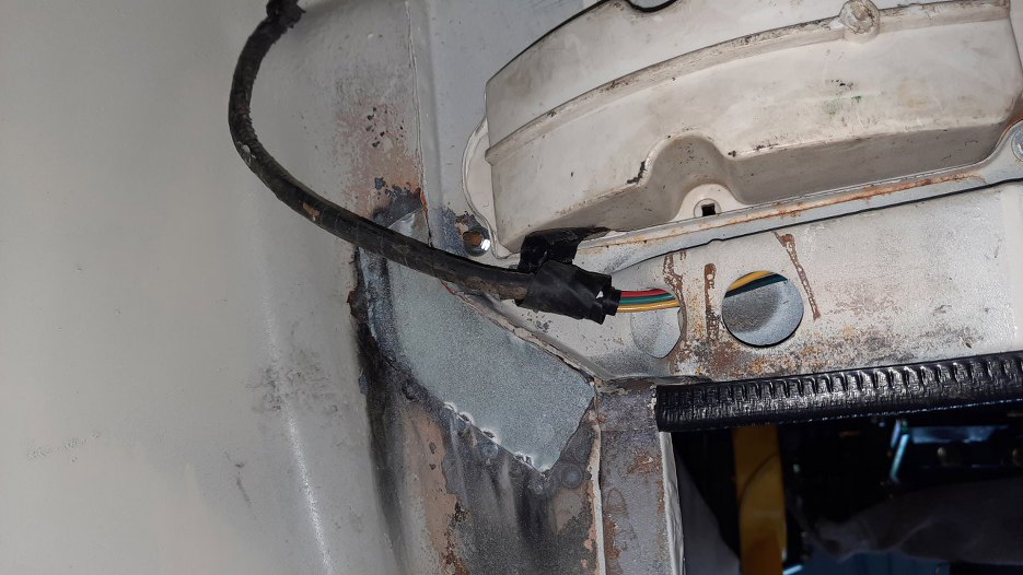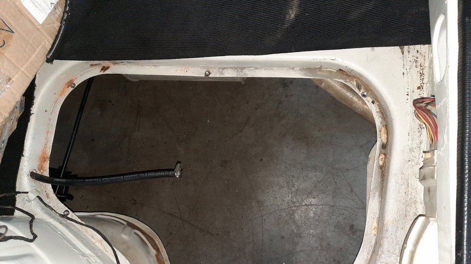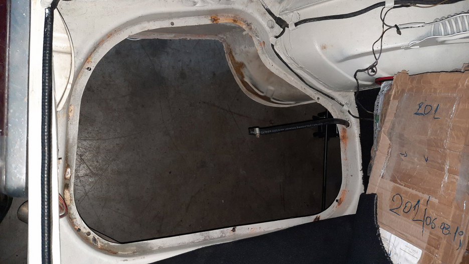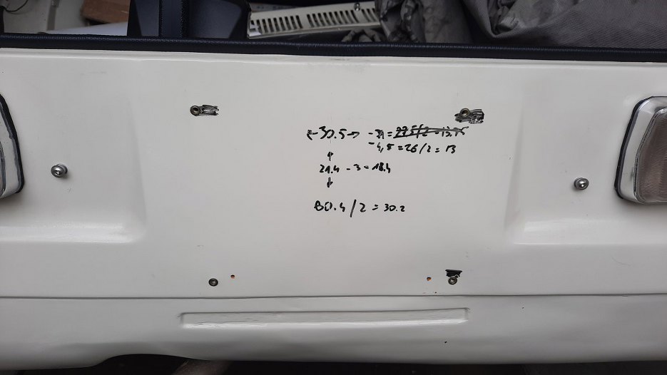 Przygotowałem też Sebastianowi miejsca na przykręcenie tylnej tablicy. Dolne otwory wykorzystałem już istniejące (dwa z czterech, nie wiem czemu ich nie zaspawali podczas remontu), górne wymierzyłem tak, żeby było symetrycznie. Notatki można robić bezkarnie na karoserii pisakiem do tablic suchościeralnych :).
