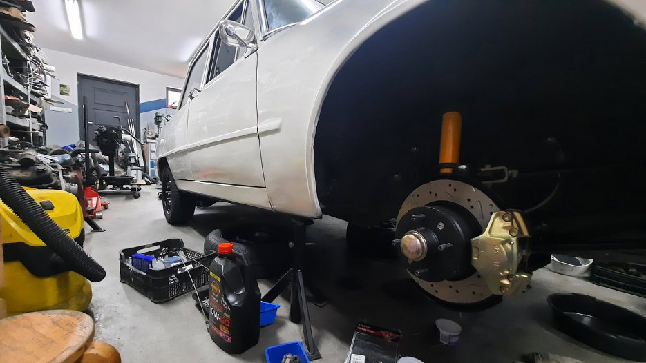Jakoś w tym czasie zacząłem stawiać samochód na kołach, bo nalałem już oleju do mostu i skrzyni. Póki tył był na ziemi, a przód jeszcze nie, odpowietrzyłem sprzęgło, bo to i dostęp jeszcze jakiś, a dzięki przodowi wyżej, odpowietrznik był lepiej ustawiony.