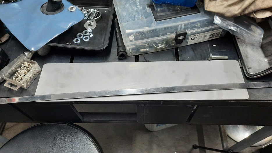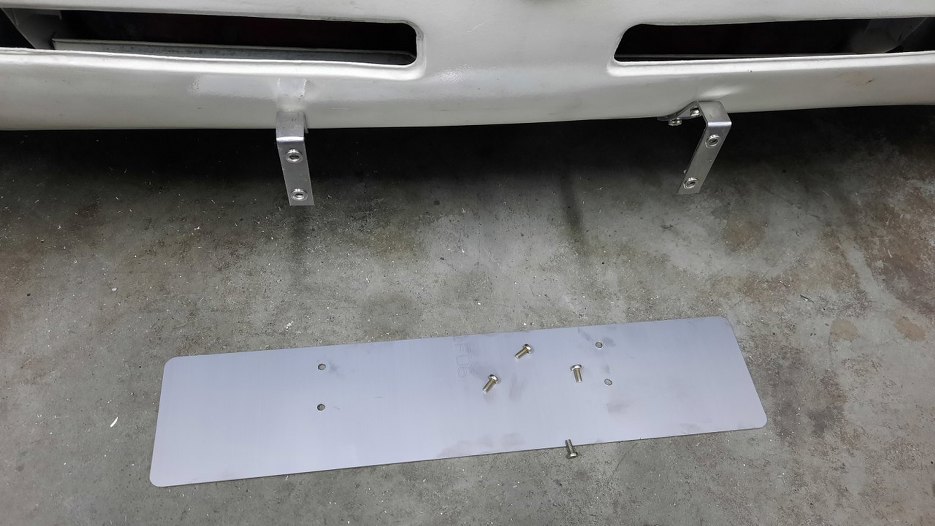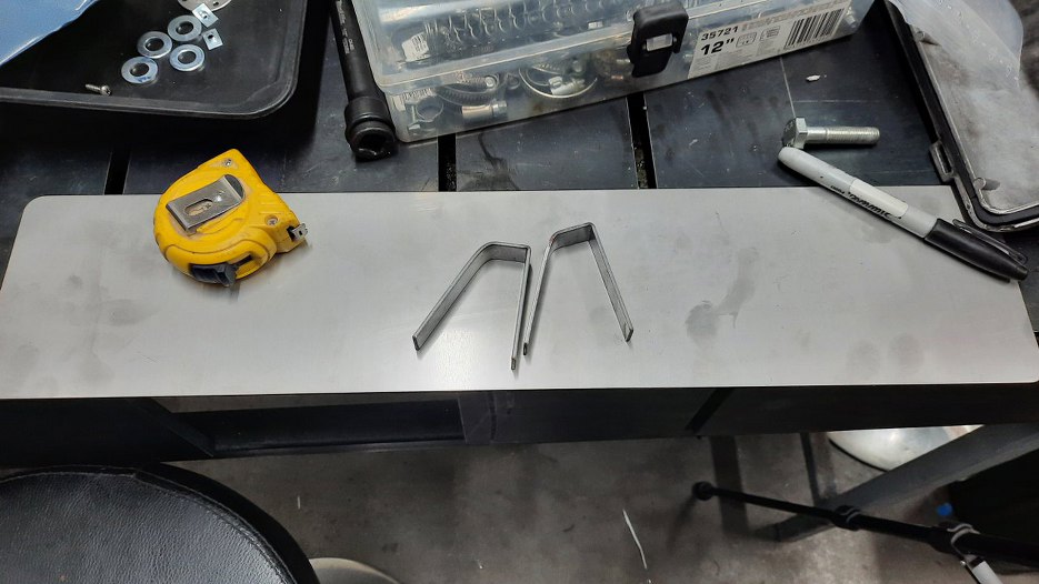 Ustaliłem z Sebastianem gdzie ma się znaleźć mocowanie tablicy rejestracyjnej. Mimo, że chciał, żeby była z boku, to nie wyglądało to dobrze i zdecydował się w końcu na tablicę pośrodku. Ja mam dorobić wszystko, co pomiędzy karoserią a tablicą. Zaczynam od blaszki z nierdzewki i płaskownika.