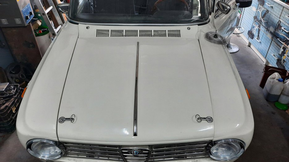 Sebastian założył zapinki na tylną klapę i zaczął montować też zapinki maski, ja dokończyłem. Bolce pionowe są wkręcone w miejsca, gdzie były odboje, więc nic nowego w karoserii nie było wiercone. Zrobione zostały tylko otwory w masce.