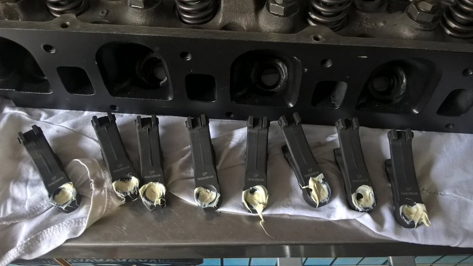 Na miejsce trafił wałek rozrządu. Poniżej widać pudełeczka z nowymi dźwigienkami.