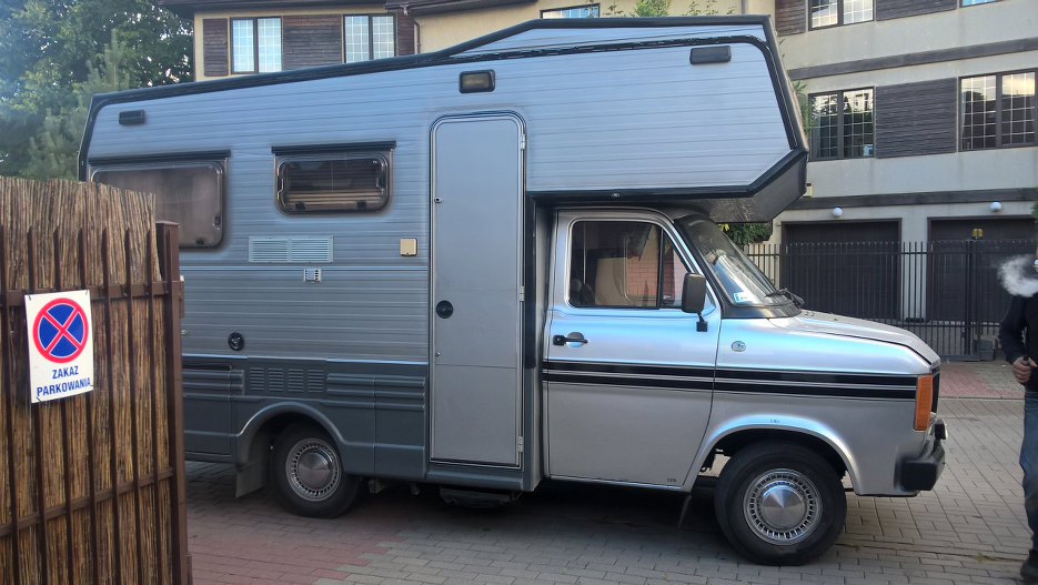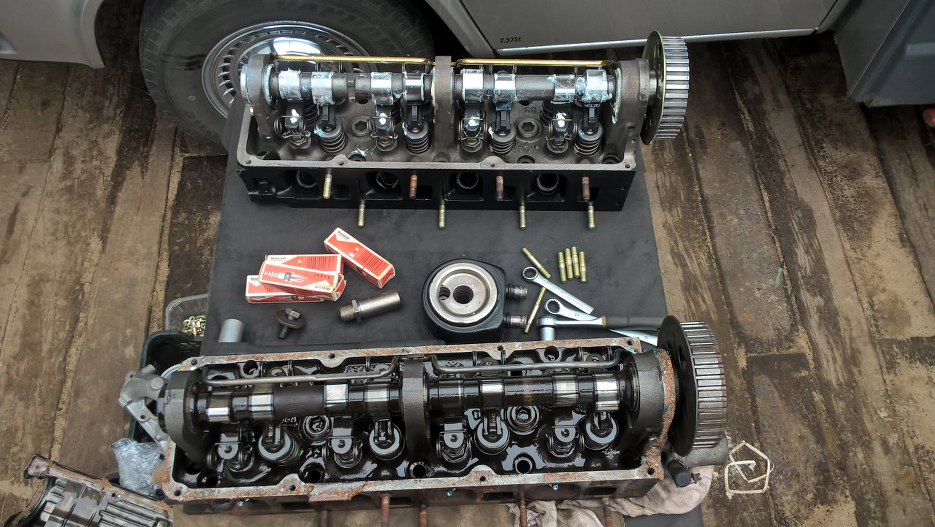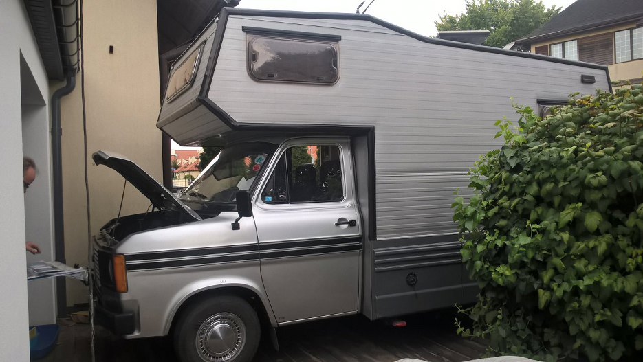 Skoro głowica jest gotowa, można było pomyśleć o założeniu jej na silnik. Przyjechał Darek z camperem. Prace trzeba było prowadzić na zewnątrz, bo jak widać do środka nie dałoby się wjechać.