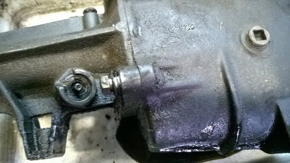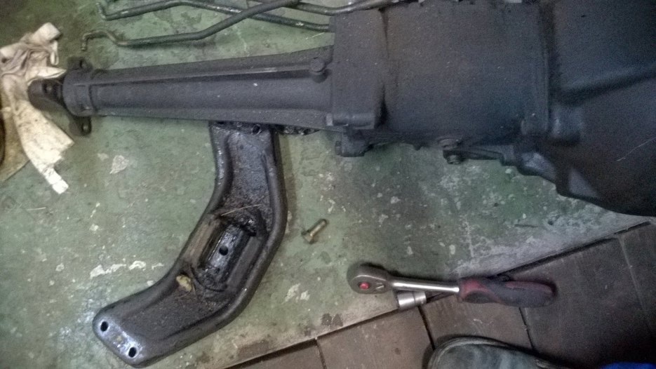 Silnik to nieco dłuższa historia, więc na początek zabrałem się za skrzynię. Cała pokryta jest grubą, naprawdę grubą warstwą oleju i brudu. Odkręciłem łapę skrzyni.