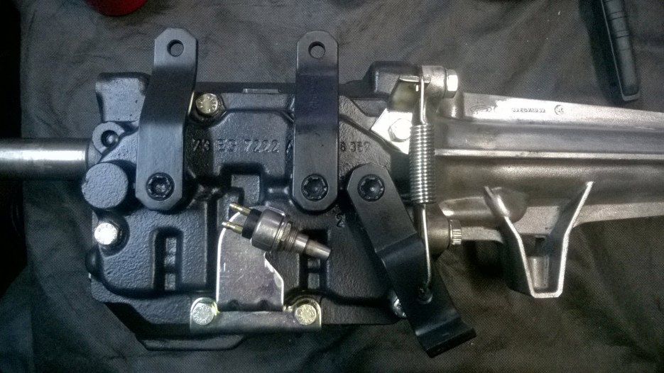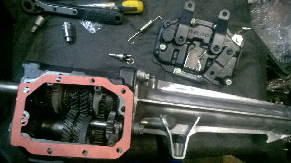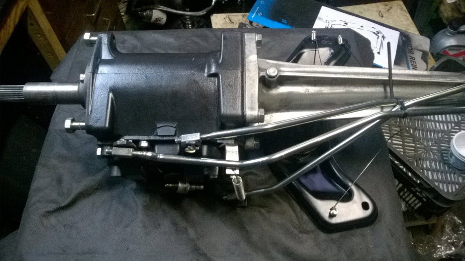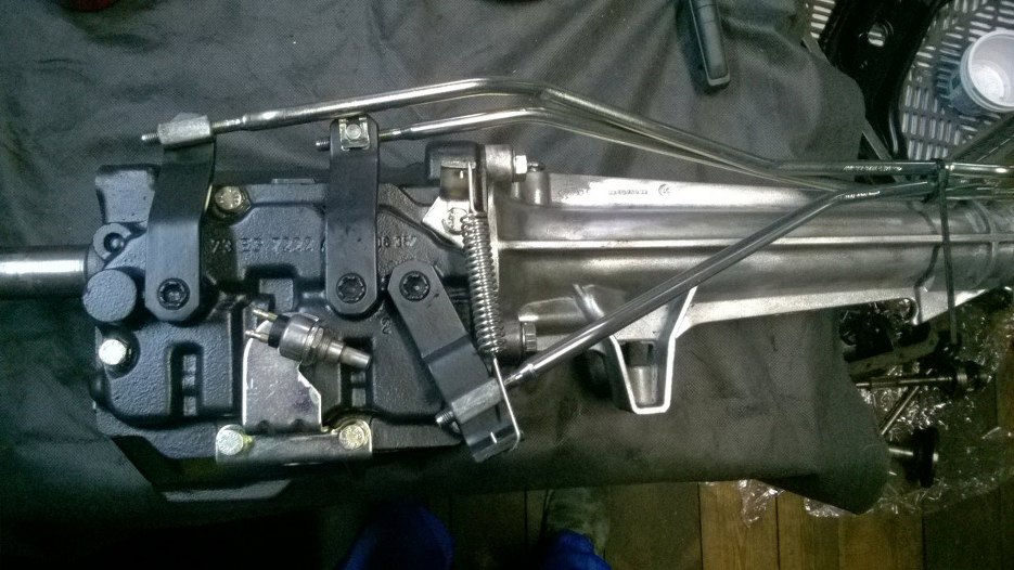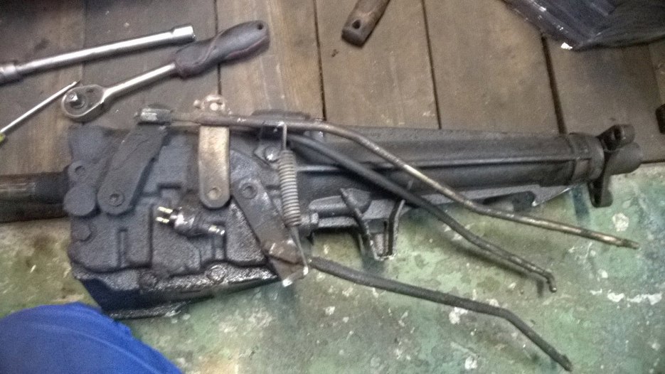 Skrzynia położona na boku. Widać wodziki - to te powyginane pręty. Łączą one wybieraki w skrzyni z dźwignią zmiany biegów.