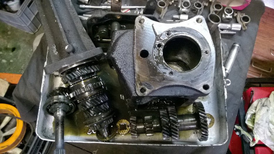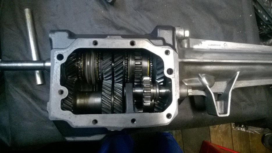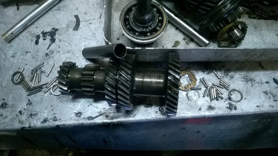 Następnie wałek wyjściowy zamontowałem w ogonie skrzyni i poskładałem biegi od pierwszego (największe koło zębate) do trzeciego.