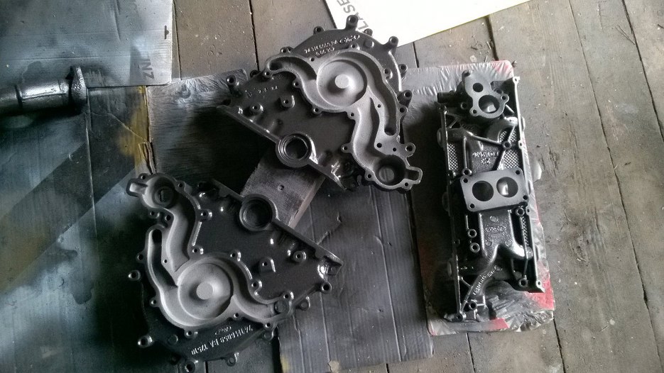 Z pokrywami poszedłem na łatwiznę i zawiozłem je do piaskowania. Najczęściej tak jest i szybciej i taniej. Pokrywy i kolektor też dostały podkłąd i dwie warstwy lakieru.