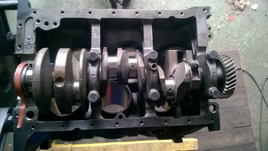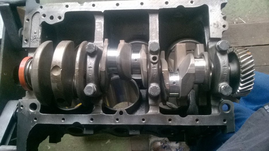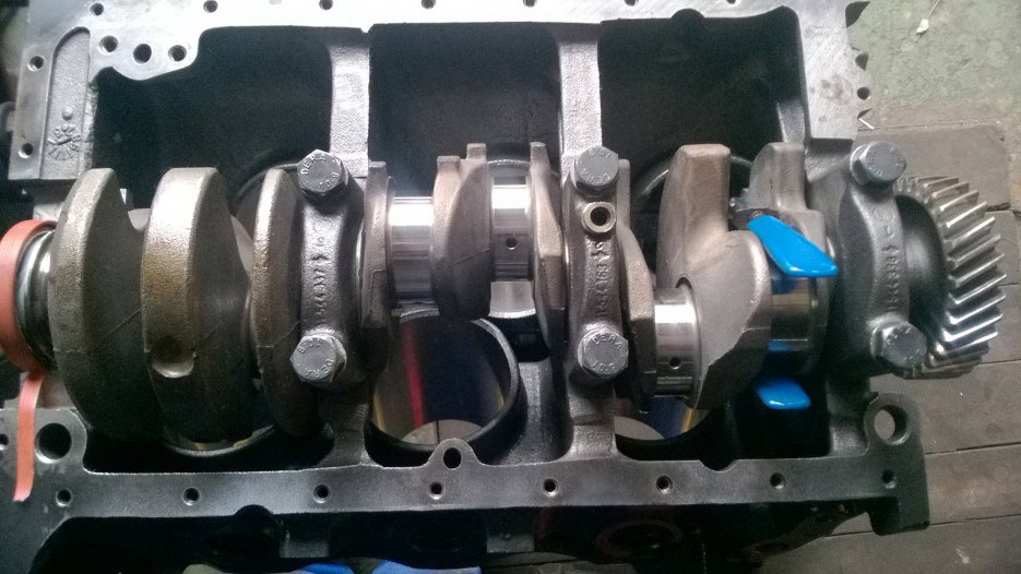 Wszystkie tłoki już włożone. Jest to trochę pracy... po włożeniu każdego zestawu warto obrócić wałem ze dwa razy, żeby sprawdzić, czy wszystko obraca się bez nadmiernych oporów.