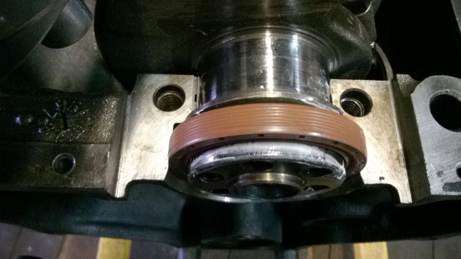 Nowy uszczelniacz już jest, można składać dalej. To białe to smar montażowy, żeby uszczelniacz nie był suchy przy pierwszym uruchomieniu silnika.