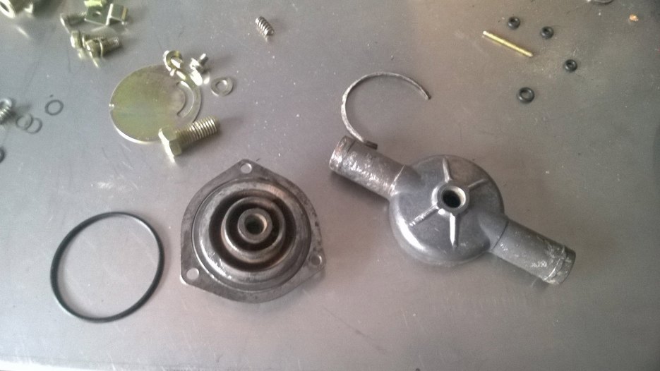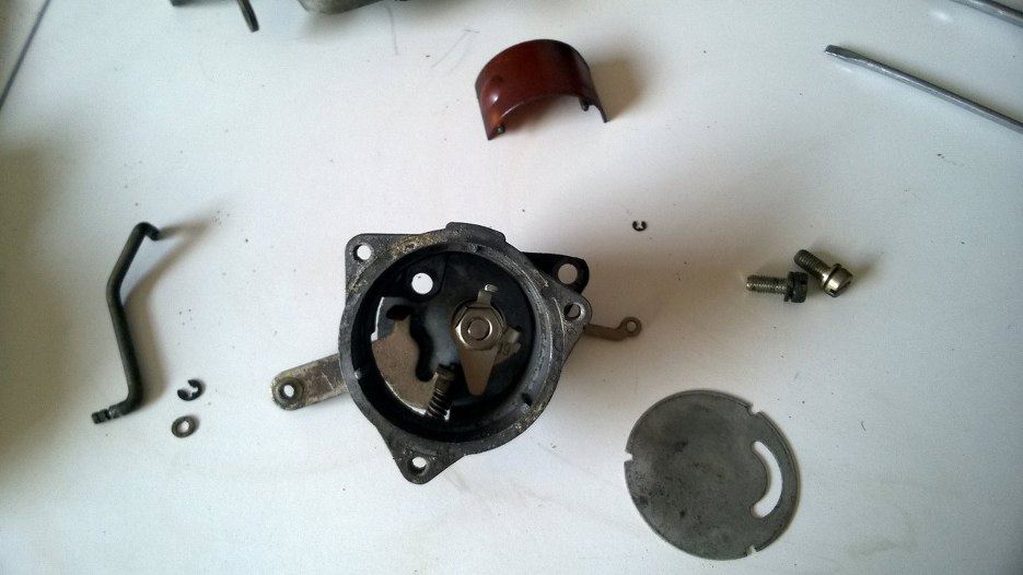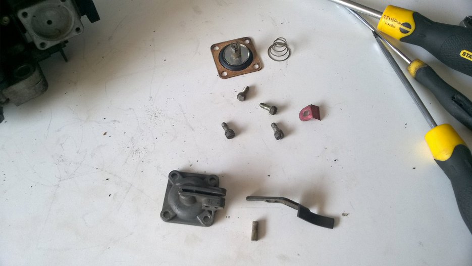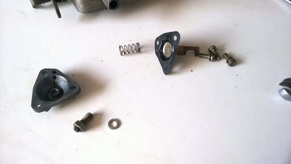 Odkręciłem mechanizm pompki przyśpieszacza. To jest ta membranka, która po wciśnięciu gazu powoduje siknięcie strumyczka benzyny do gardzieli gaźnika.