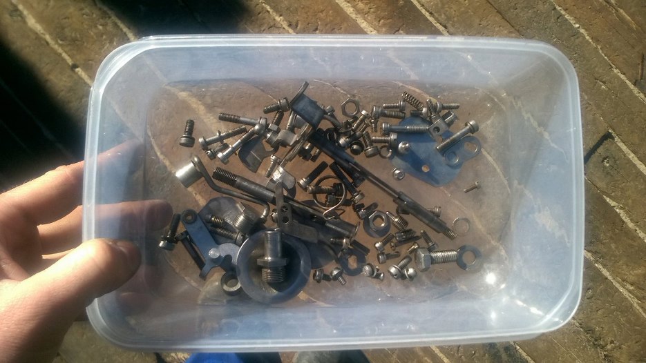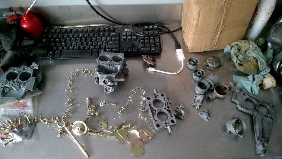 Wszystkie części gaźnika umyte, zestaw naprawczy przygotowany, śrubki jeszcze na drucikach, świeżo z galwanizerni odebrane.