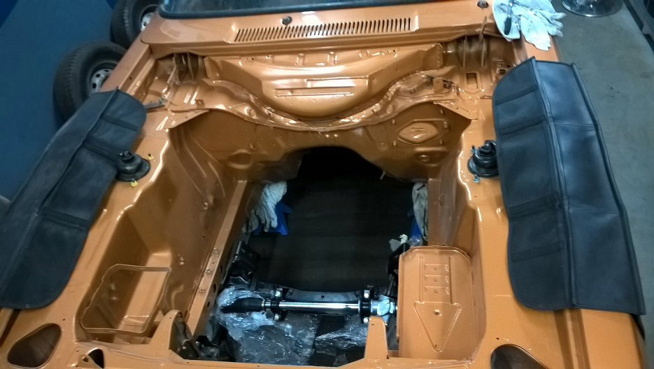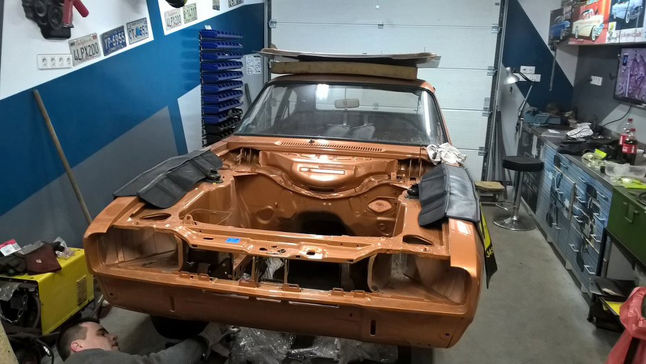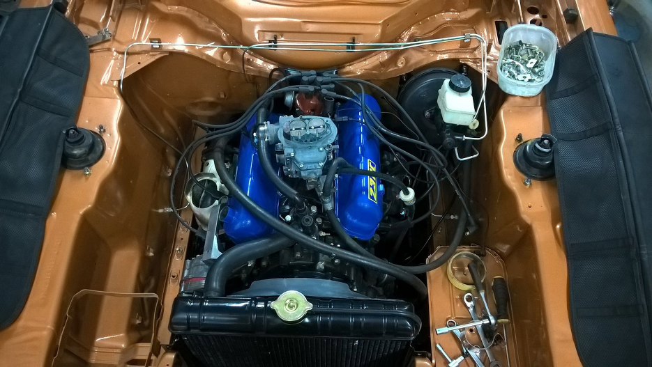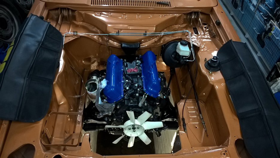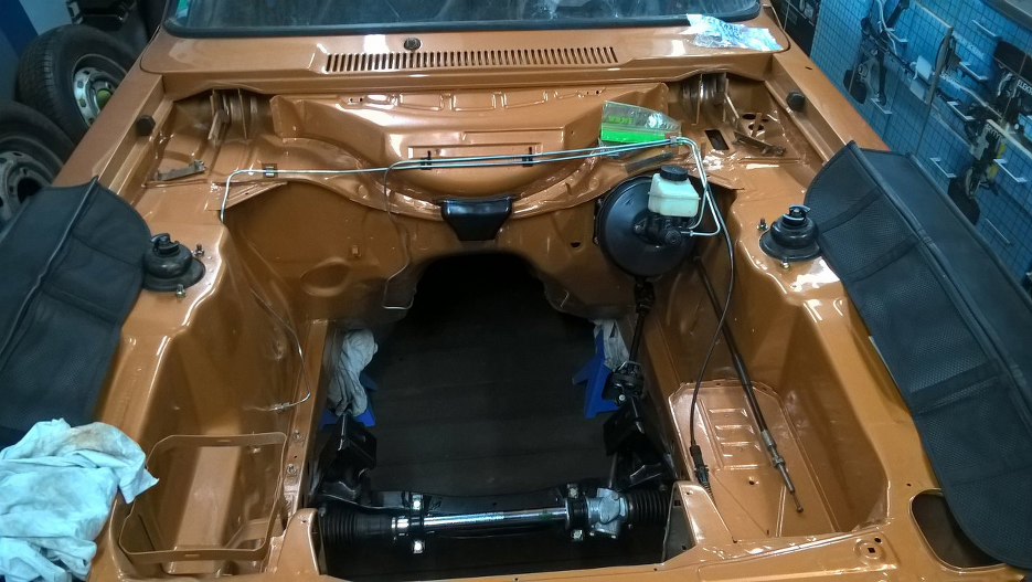 Arek odebrał już samochód od lakiernika. Przywiózł go od razu do mnie, żebyśmy włożyli silnik. Zdjęliśmy maskę. W komorze silnika bardzo ładnie polakierowane, nie ma niedomalowanych miejsc. Za to pusto :). Jest tylko zawieszenie, zresztą nie do końca dokręcone nawet.
