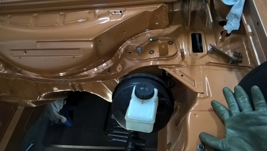 W środku założyłem cały mechanizm pedałów gazu, sprzęgła i hamulca. Od strony komory silnika jest to przykręcone dwiema śrubami z gumowymi podkładkami. Oryginalne gumki już dawno przestały isnieć, więc dociąłem nowe.