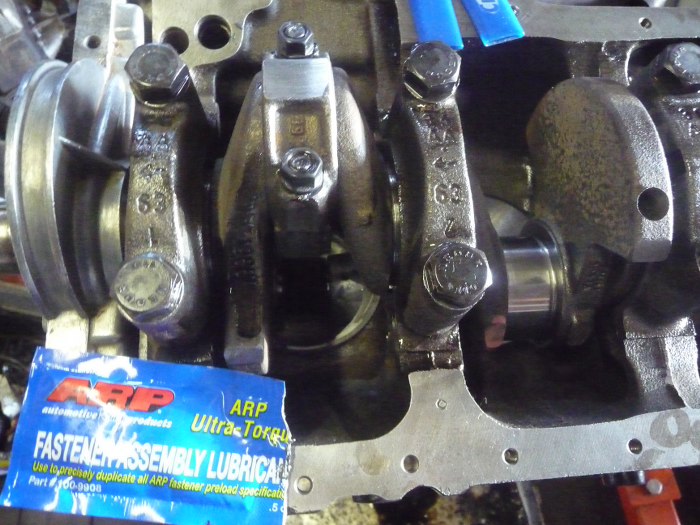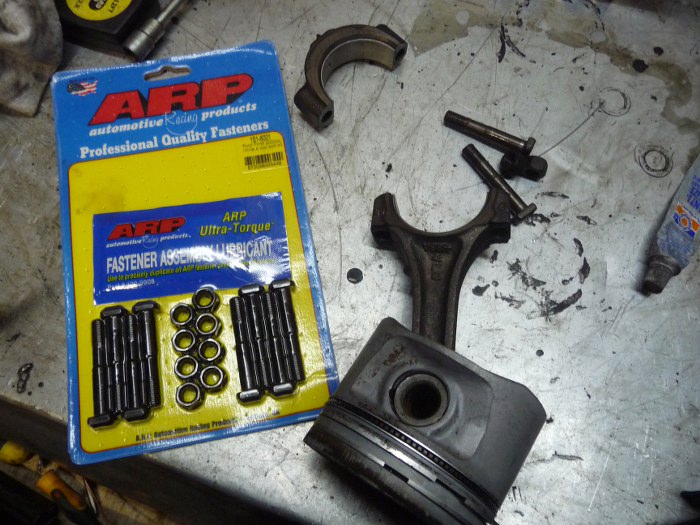 Po odebraniu bloku i tłoków ze szlifierni (blok był szlifowany pod tłoki, a nie na wymiar książkowy, w celu uzyskania większej dokładności pasowania) wymieniłem śruby korbowodów na ARP. Po doświadczeniach klubowych kolegów (a zwłaszcza jednego - Darka Pająka) z urywającymi się śrubami, wolę nie ryzykować. Następnie cały układ korbowo tłokowy razem z kołem pasowym, zamachowym i dociskiem sprzęgła trafił do szlifierni na wyważenie. Koło zamachowe zostało też trochę odelżone.