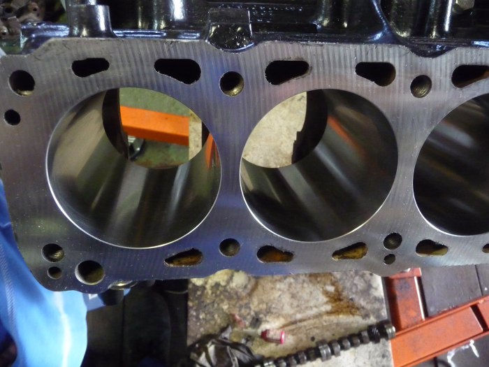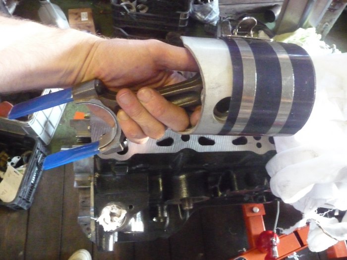 Zrobiłem tak po kolei dla każdego tłoka, po każdym sprawdzając, czy wał się obraca o pełne 360o bez zacięć i oporów. W silniku tego typu normalnym jest, że gdy 2 tłoki są w górnym martwym punkcie, a dwa kolejne w dolnym, to wął obraca się dużo lżej - spory kąt obrotu wału przenosi się na małą drogę przebytą przez tłok. Inaczej jest pośrodku drogi tłoków w cylindrach - tam opór jest sporo większy, ale jest to normalne.