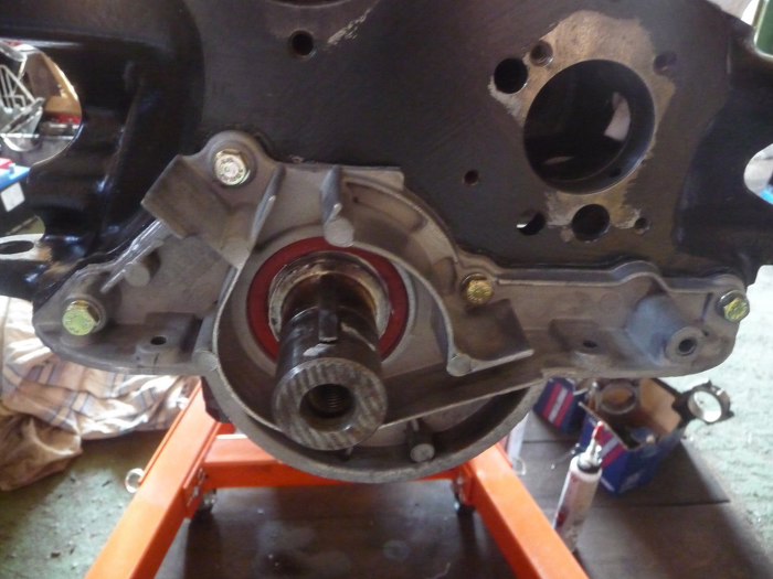 Przykręciłem pompę oleju. Koniecznie w tym momencie trzeba pamiętać o sześciokątnym pręcie napędzającym pompę oleju od aparatu zapłonowego - ma on kołnierz zapobiegający wyjęciu tego napędu podczas wyjmowania aparatu zapłonowego, dlatego trzeba włożyć pręt od dołu. Od góry można włożyć pręt, ale już bez kołnierza... Wracając do pompy oleju - wyjąłem z niej koła zębate i wymyłem ze smaru montażowego. Następnie nalałem do środka nieco oleju silnikowego.