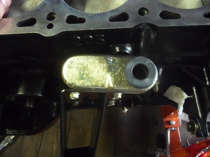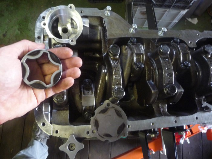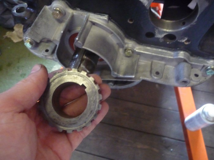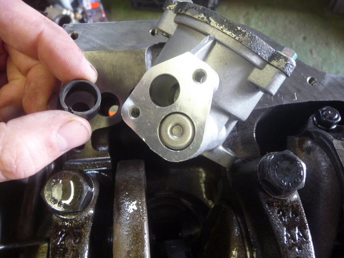 Skoro układ korbowo-tłokowy mam poskładany, to wziąłem się za reszte rzeczy w skrzyni korbowej, żebym mógł to zamknąć miską olejową. Przygotowałem nową pompę oleju (najtańsze ubezpieczenie przeciwko nieszczęśliwym wypadkom podczas remontu silnika to właśnie nowa pompa oleju). Przy tym silniku nie było nawet śrub do niej, więc musiałem je pozyskać z tego drugiego. Wyjąłem też z drugiego bloku tulejkę ustalającą pompę w bloku (trzymam ją w palcach).