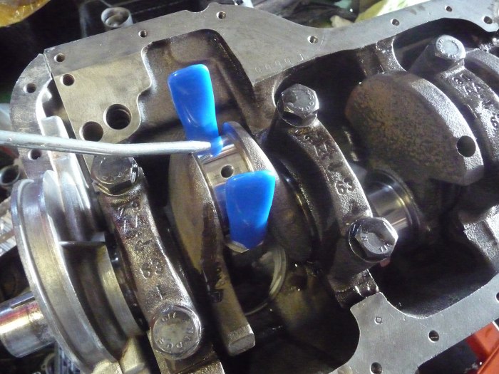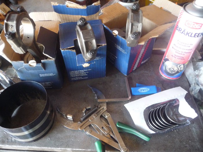 Następnego dnia wziąłem się za tłoki. Z każdego zdjąłem pierścienie (fabrycznie były założone), odkręciłem stopki korb i porządnie wszystko umyłem. Następnie założyłem panewki i dokręciłem odpowiednim momentem stopki korb. Moment ten jest inny dla fabrycznych śrub, i inny dla śrub ARP. Śruby ARPa wymagają też dedykowanego smaru montażowego. Po dokręceniu pomierzyłem wewnętrzną średnicę panewki sprawdzając, czy jej wymiar w stosunku do czopu wału będzie odpowiedni.