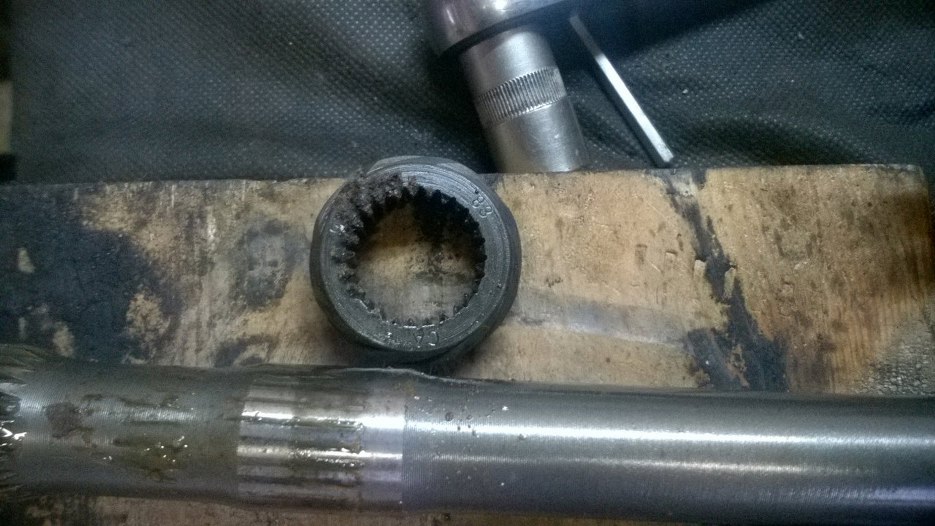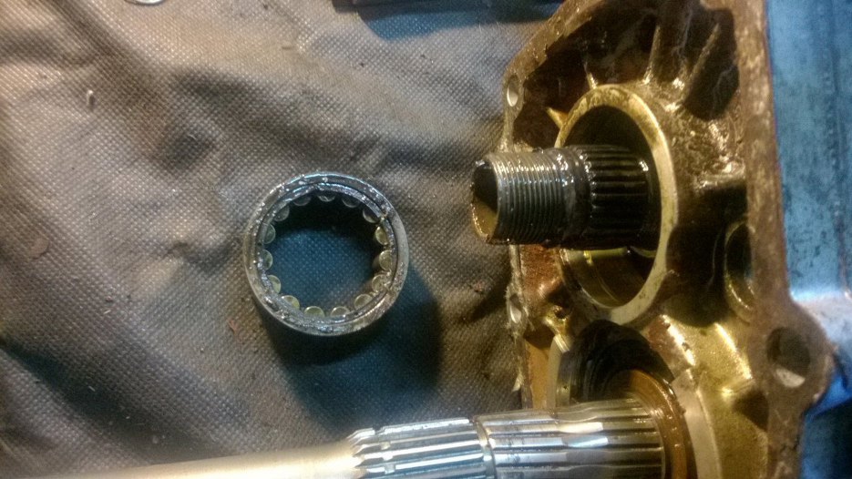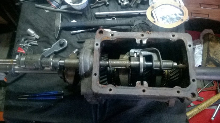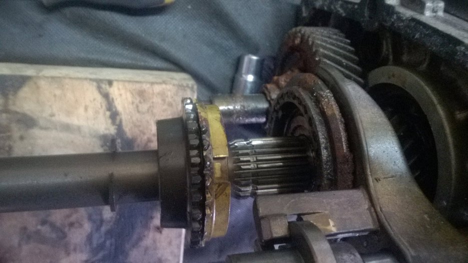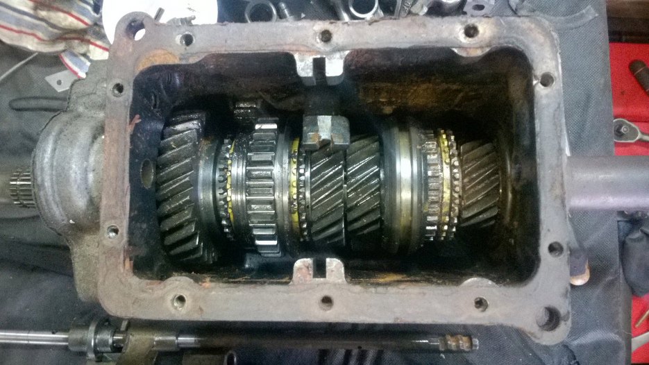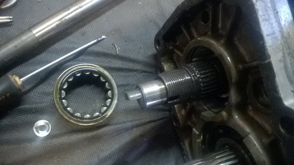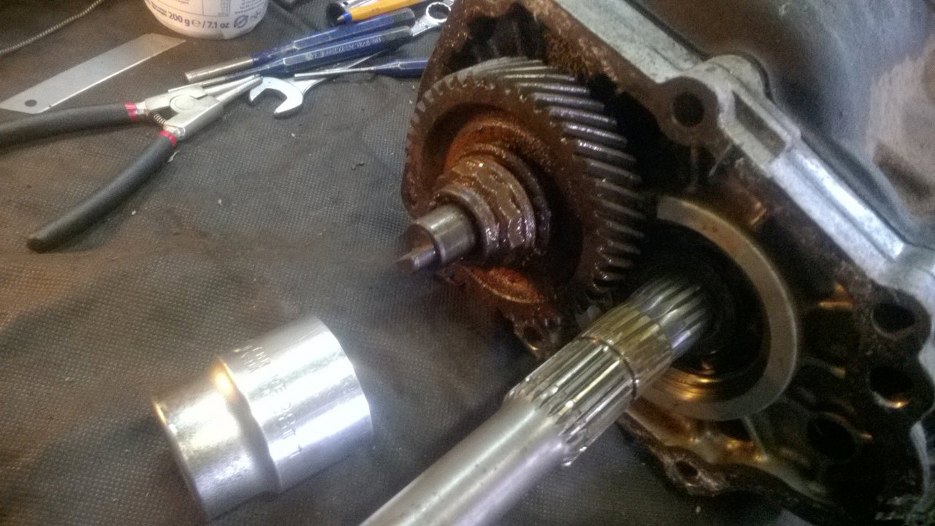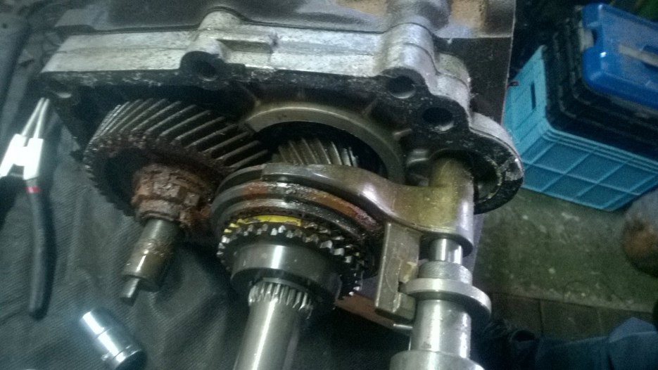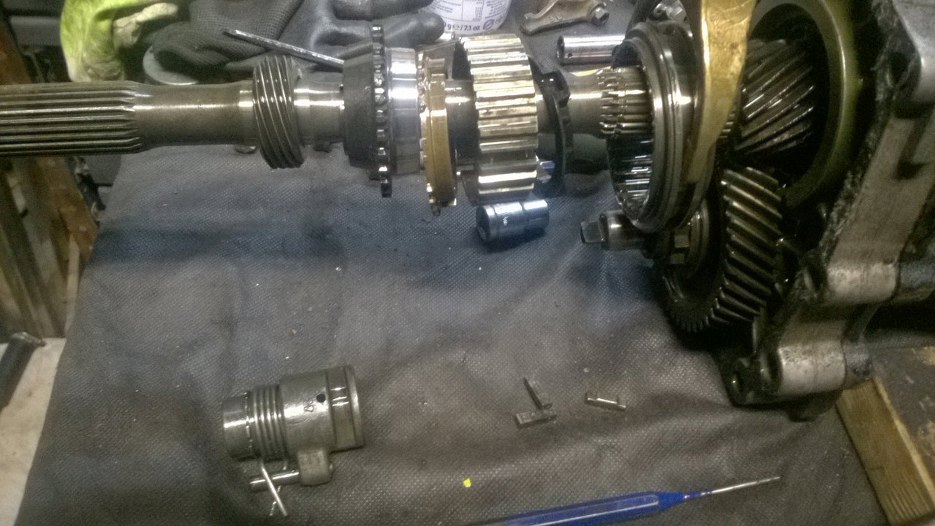 W każdym razie, po zdemontowaniu piątego biegu można już zębatki główne, czyli potocznie nazywaną "choinkę" odsunąć nieco na bok i wyjąć z przodu wałek sprzęgłowy, a z tyłu skrzyni plasterek obudowy razem z wałkiem wyjściowym i całą resztą kół zębatych.
