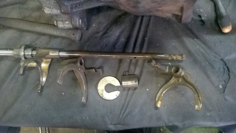 W międzyczasie jeszcze rozbroiłem część odpowiadającą za wrzucanie wstecznego biegu. Przy wybijaniu pinu warto mieć po drugiej stronie przygotowany magnes, żeby pin nie poszedł sobie zwiedzać okolicy.