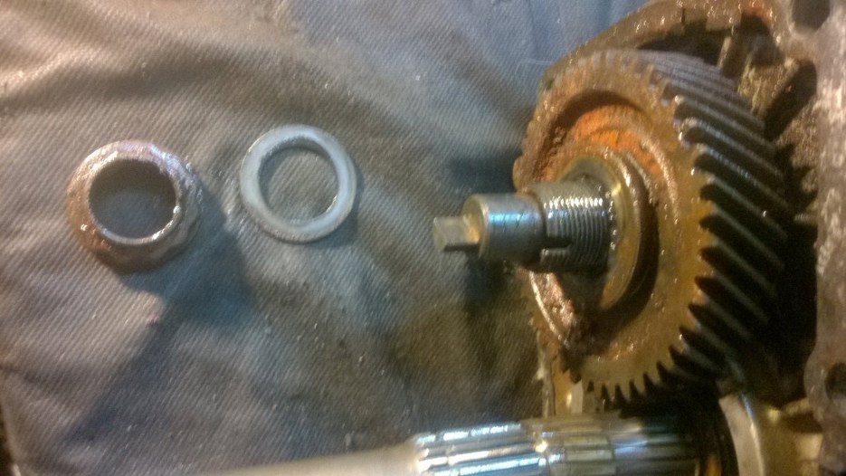 Teraz trzeba odkręcić dużą nakrętkę trzymającą koło zębate piątego biegu. Przykręcona jest dość sporym momentem, więc trzeba mieć długa przedłużkę do klucza. No i trzeba mieć pomysł jak zablokować całość, żeby się nie obróciła :)