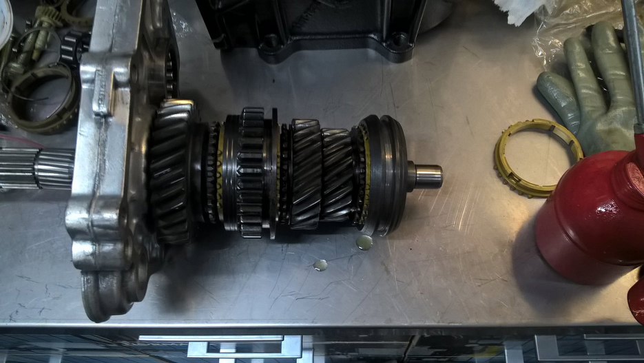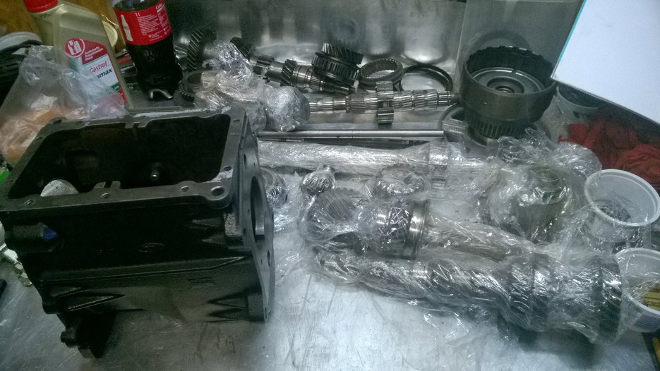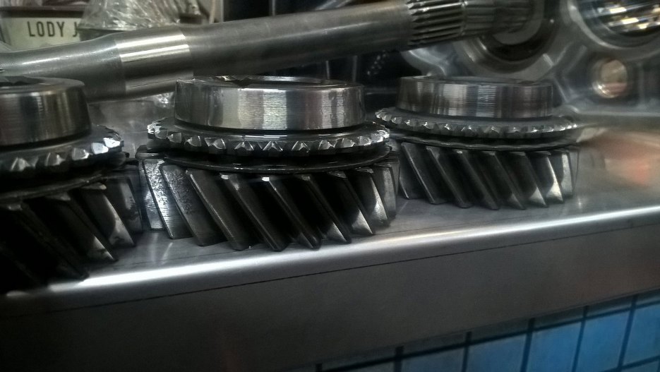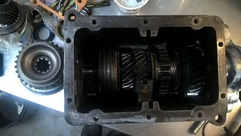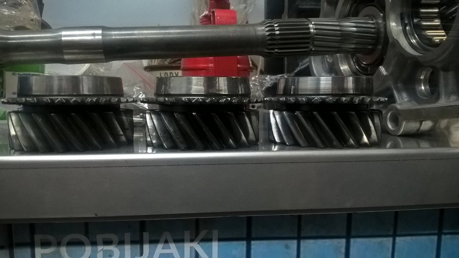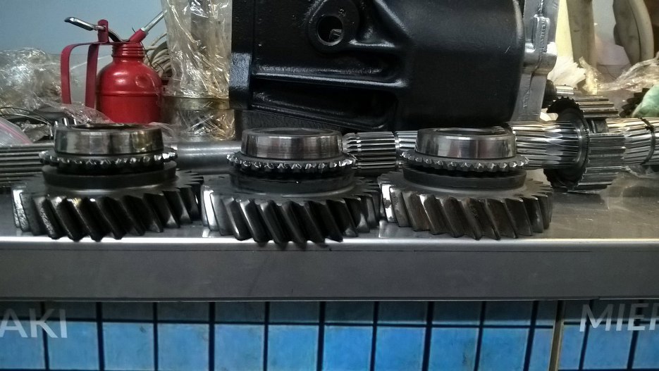 I w tym momencie nastąpił przestój w pracach nad tą skrzynią. Okazało się, że zębatki 1, 2 i 3 biegu z obu skrzyń mają takie wżery, że nie mogę ich na spokojnie włożyć do skrzyni, którą składam... Nastąpiło długotrwałe poszukiwanie skrzyni - dawcy części. Tak minął ponad rok. Całe szczęście, że auto nie gotowe i pilne to nie było. Inna sprawa, że przez to i poszukiwania części nie były jakieś dynamiczne :). Nagle pojawiła się skrzynia na horyzoncie.