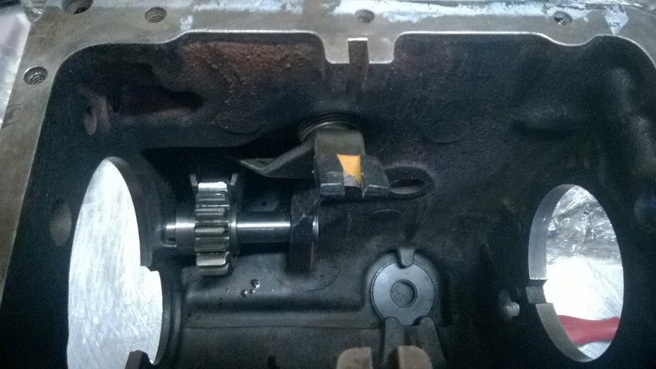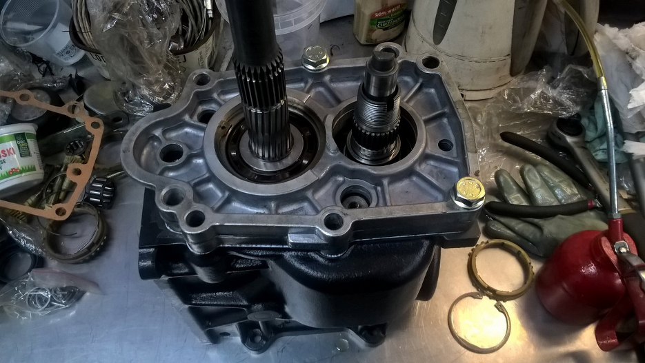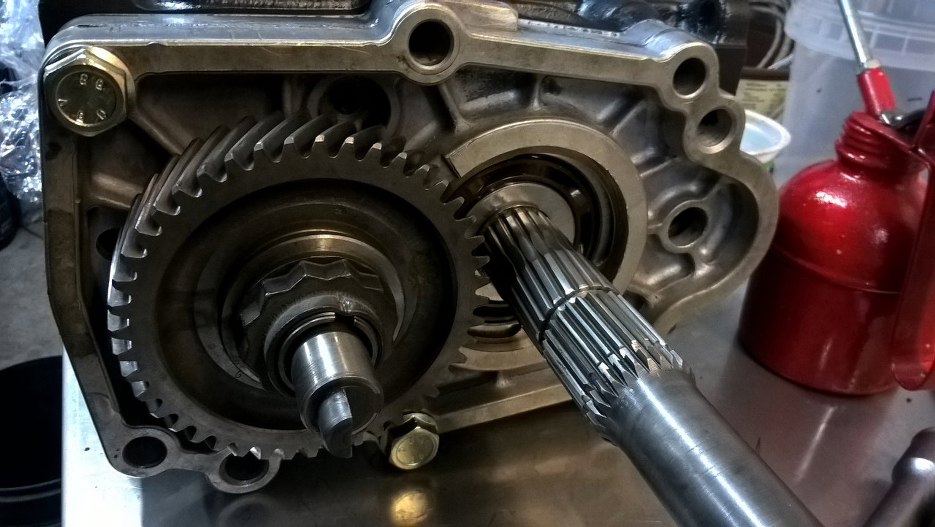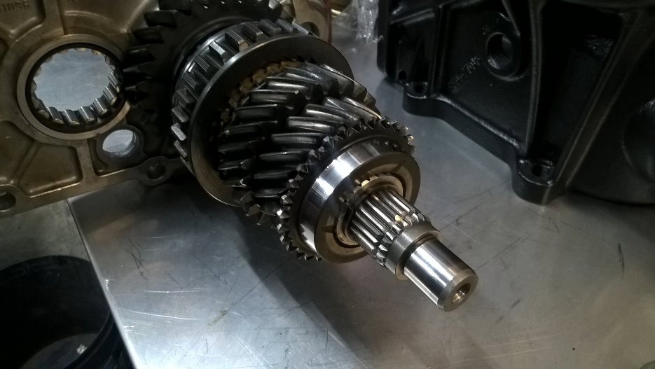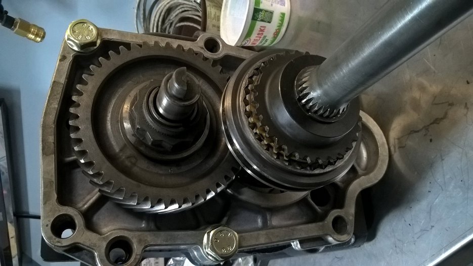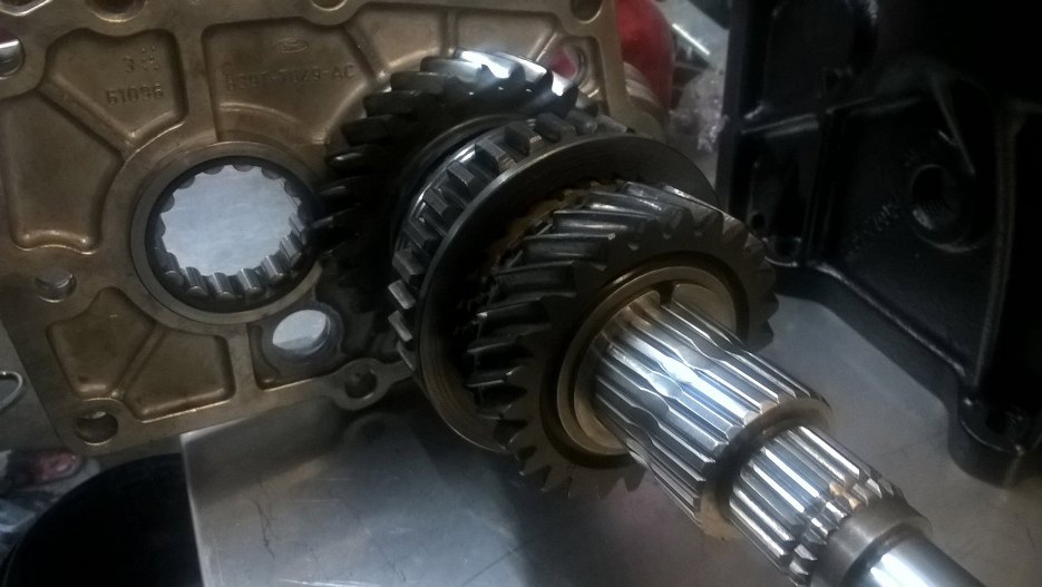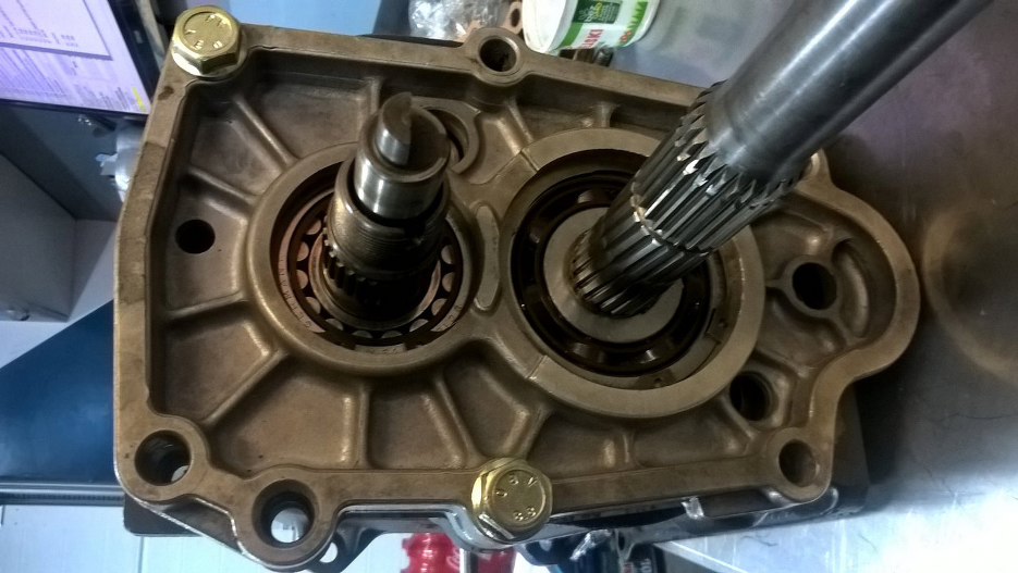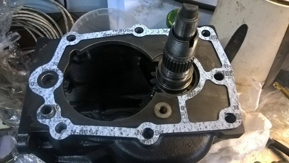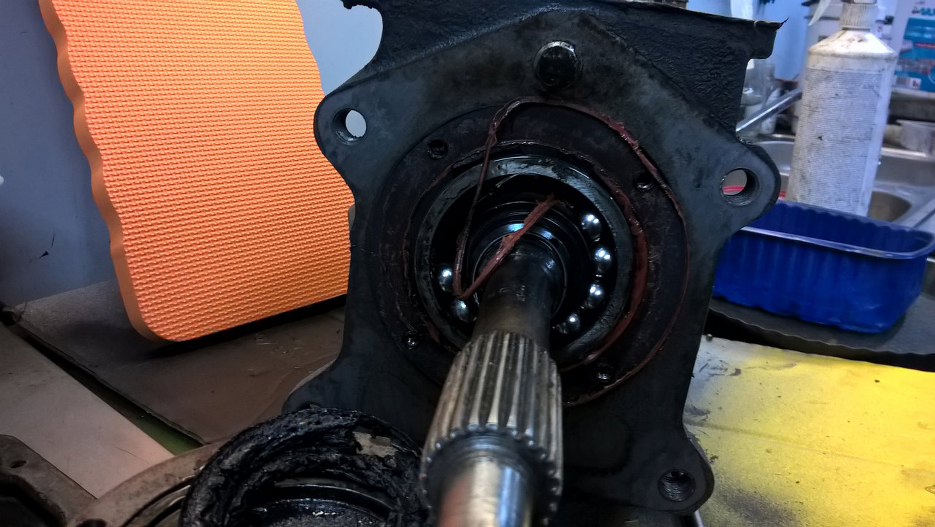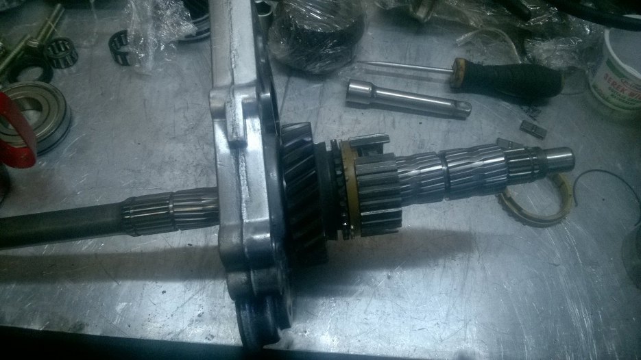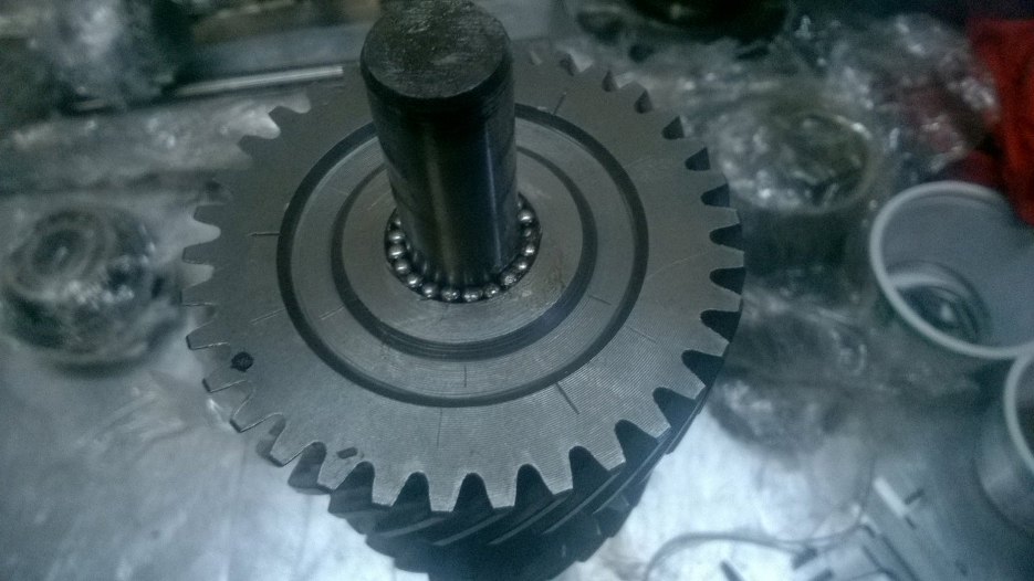 Wałek wyjściowy uzbroiłem w koło zębate pierwszego biegu i włożyłem w łożysko w płytce piątego biegu. Łożyska właściciel załatwił nowe.