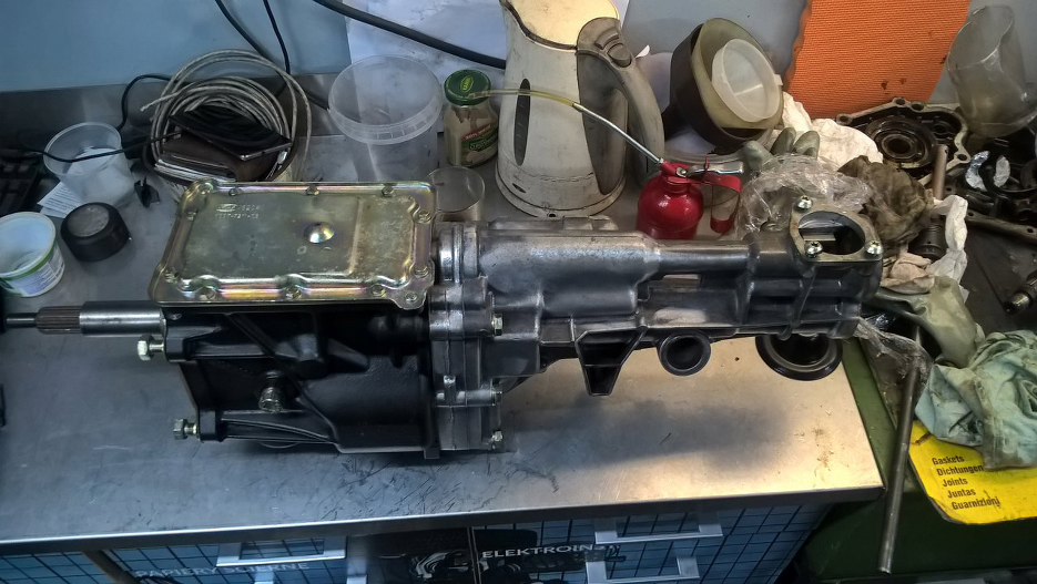 Po przykręceniu pokrywy wkręciłem śruby z przodu skrzyni - dzwon jest przy silniku, więc zostanie przykręcony pewnie dopiero podczas wkładania całości do auta. Wtedy też zostanie wlany olej. Chyba gotowe :).