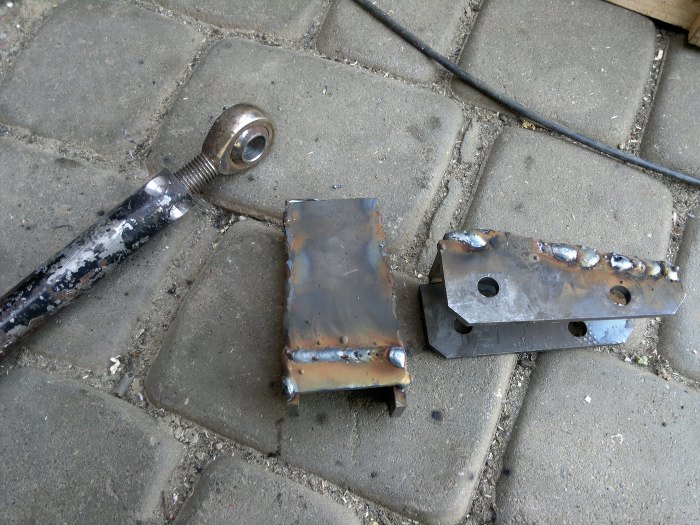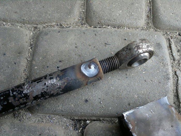 Wycięte więc zostały porządniejsze elementy. Tu zacząłem je już spawać. Obok widać stary drążek reakcyjny. Gwint uniballa wkręciłem do połowy i nawierciłem z czterech stron.